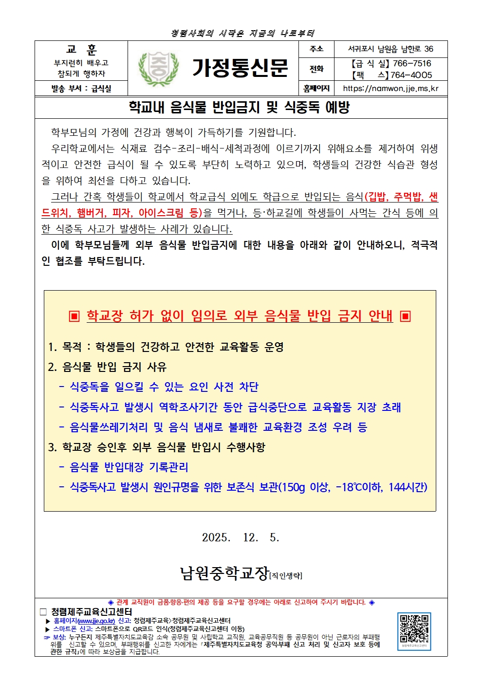 식중독 예방을 위해 학교내 외부음식물을 반입 금지 하오니 학부모님들의 적극적인 협조 부탁드립니다.