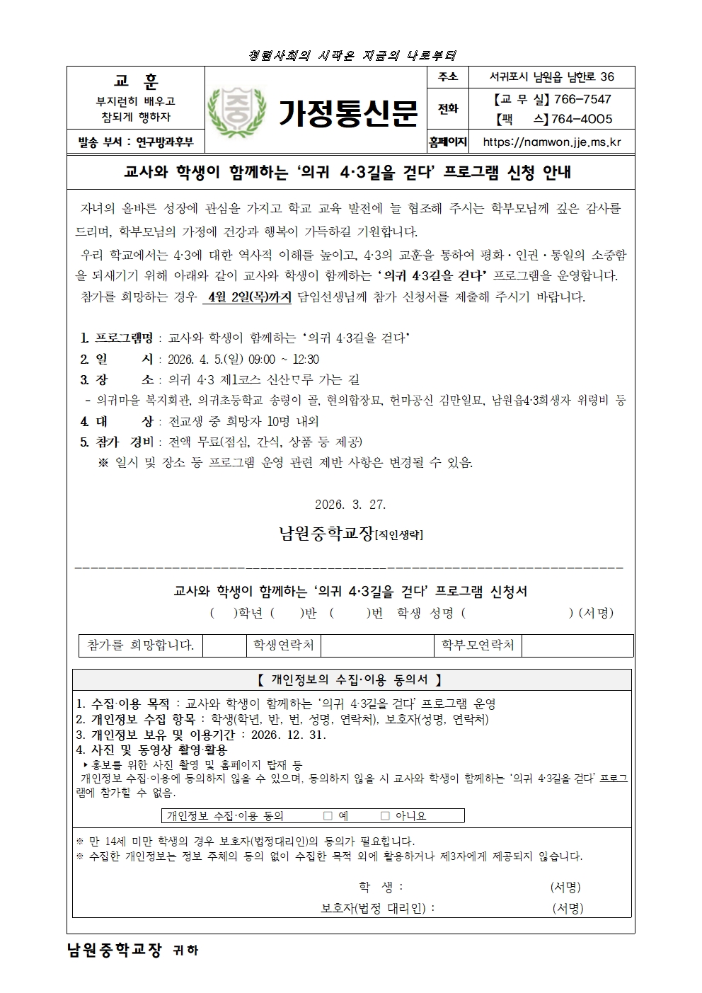 교사와 학생이 함께하는 ‘의귀 4·3길을 걷다’ 프로그램 신청 안내