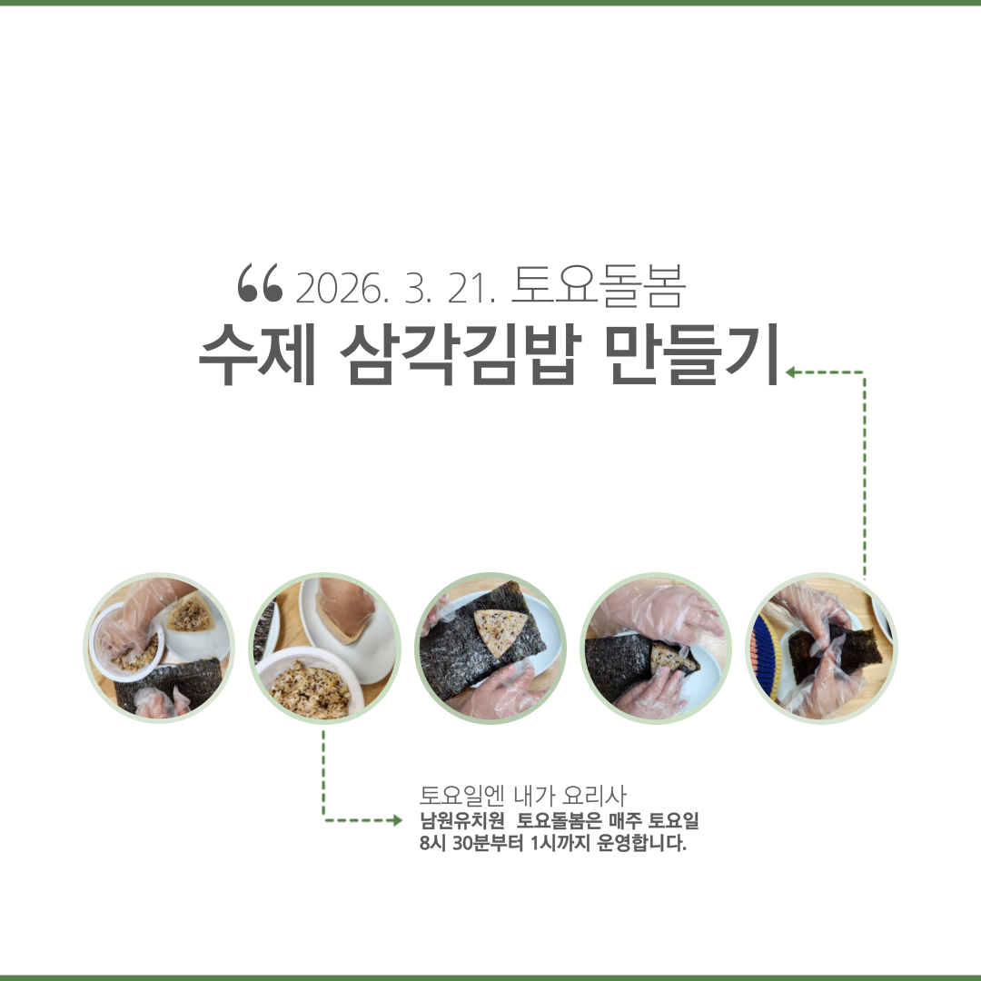 남원유치원 토요돌봄은 자유놀이, 바깥놀이, 요리활동으로 이루어집니다. 형님, 동생 함께 놀이하며 맛있는 간식을 만들어 먹으며, 정을 나누는 행복한 시간이랍니다.
