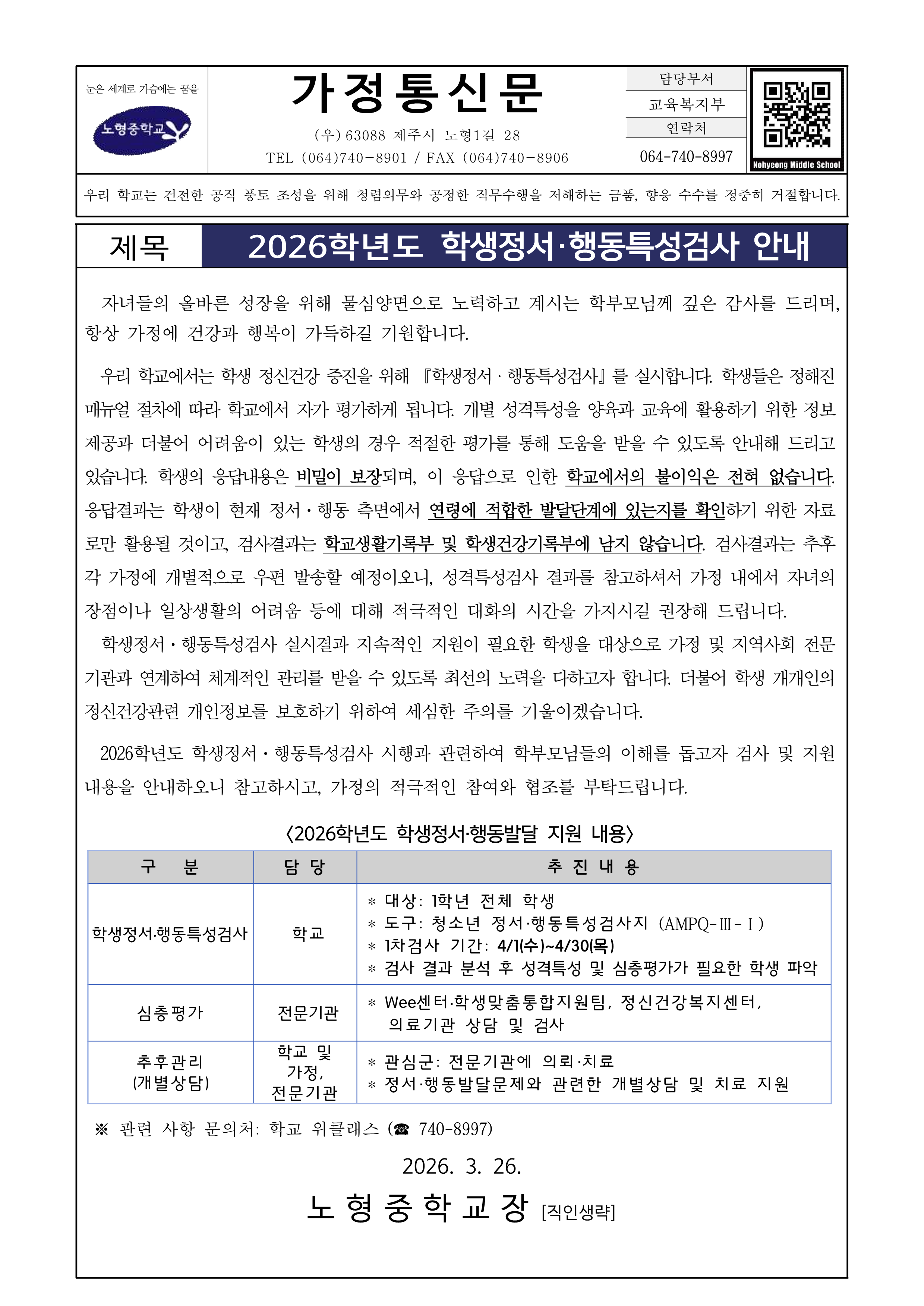 2026학년도 학생정서ㆍ행동특성검사 안내
