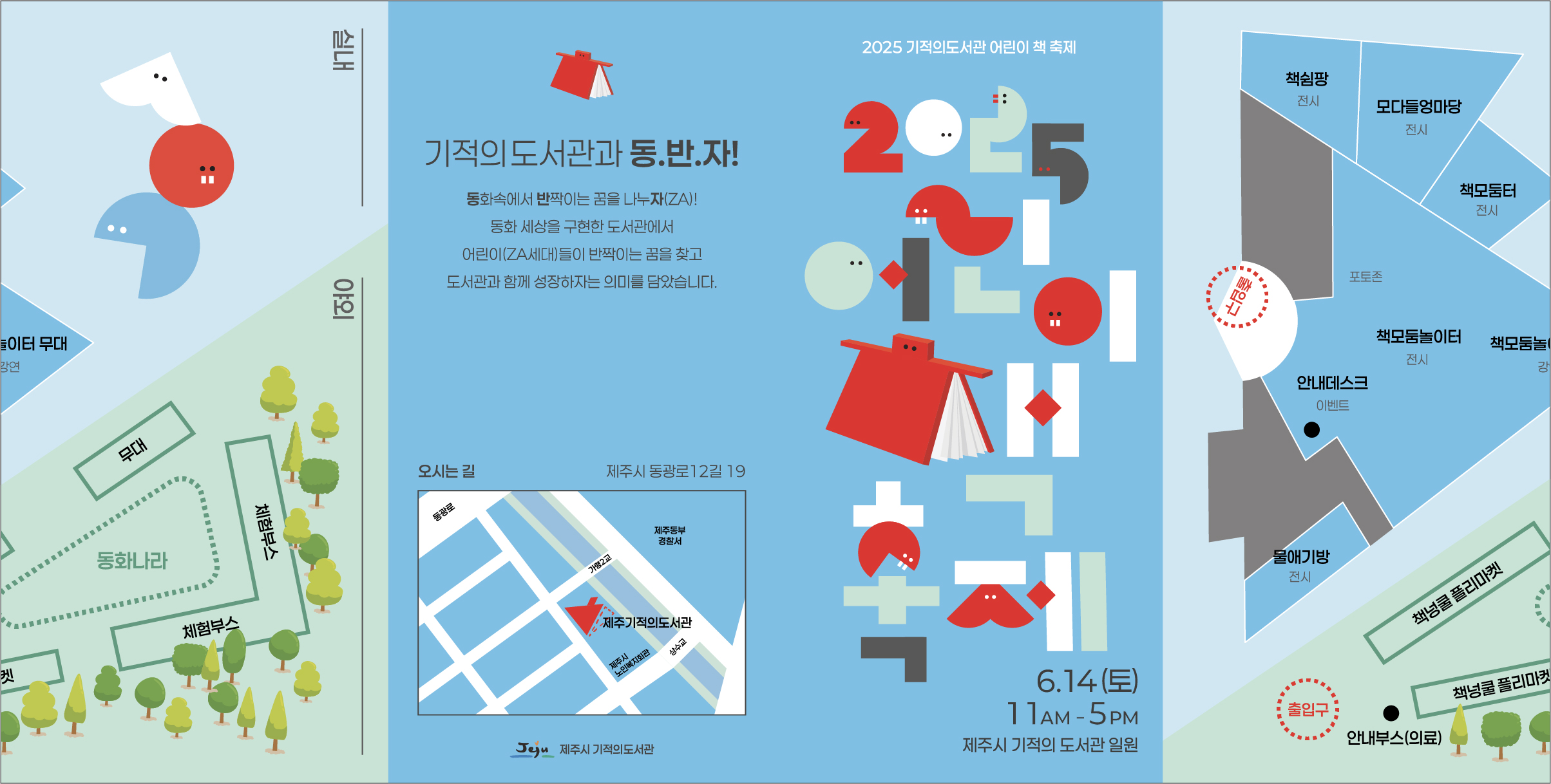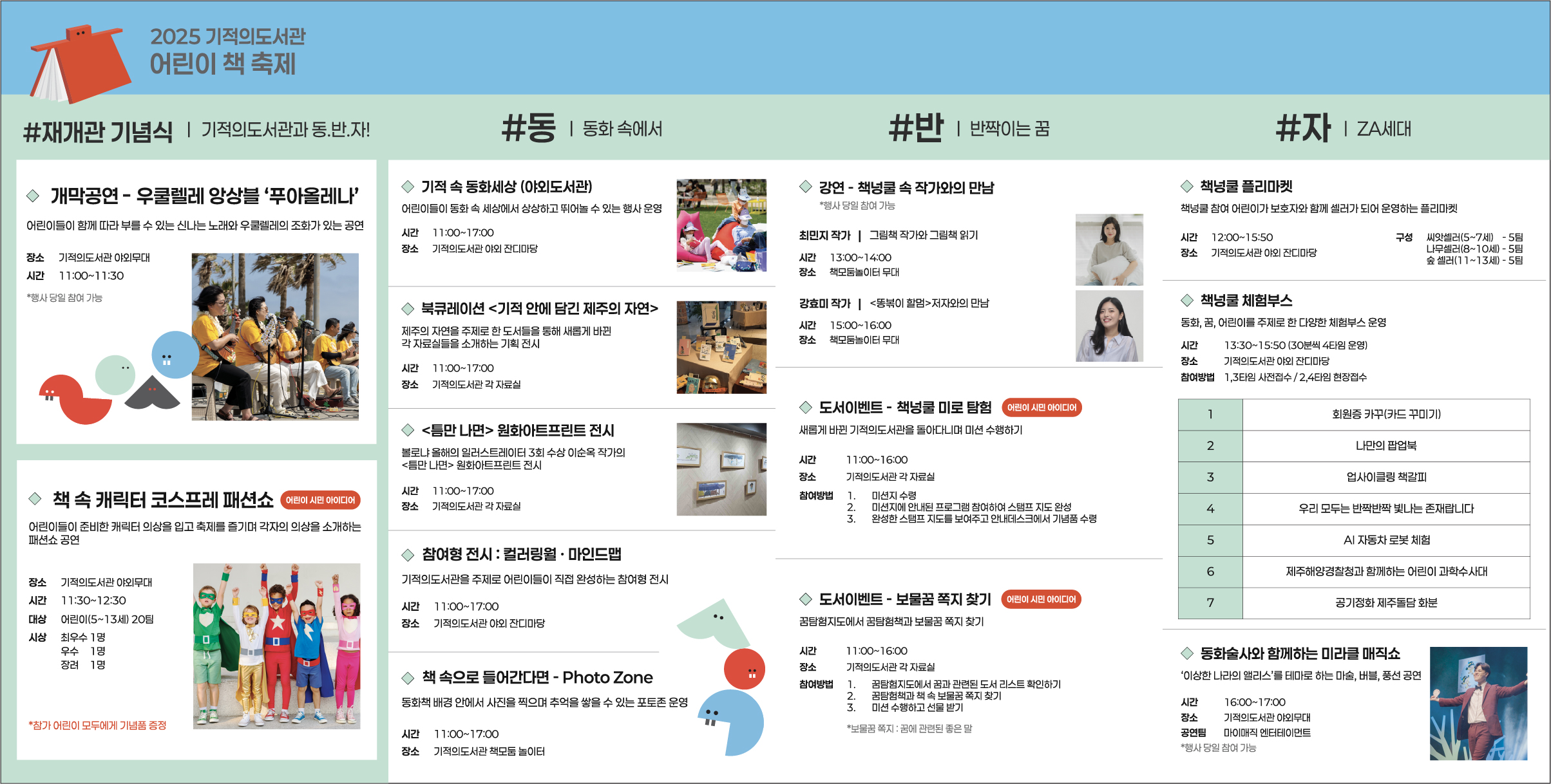 '어린이 전문 독서문화 공간 조성 사업'을 통해 새롭게 재개관한 기적의도서관을 소개하고 동화 속 세상을 구현한 행사장에서 어린이들과 가족들이 다채로운 독서문화행사를 즐길 수 있는「2025 어린이 책 축제」가6. 14.(토) 제주시기적의도서관에서 개최하오니, 책을 사랑하는 많은 참여 부탁드립니다.