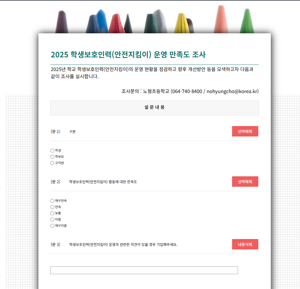 2025년 학교 학생보호인력(안전지킴이)의 운영 현황을 점검하고 향후 개선방안 등을 모색하고자 다음과 같이 조사를 실시합니다. 학생 및 학부모님의 적극적인 참여 부탁드립니다.
