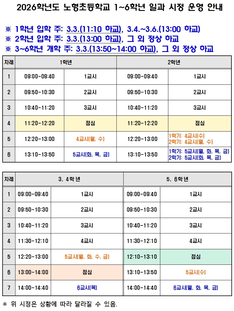 2026학년도 노형초등학교 1~6학년 일과 시정 운영 안내