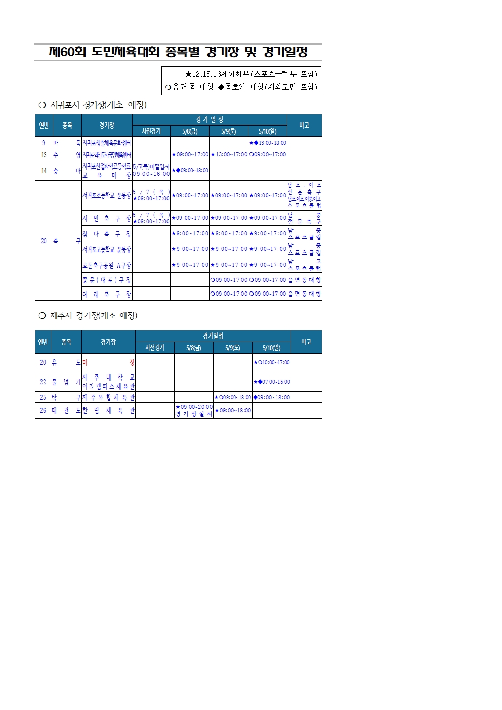 제60회 제주특별자치도민체육대회 종목별 경기장 및 경기일정 안내