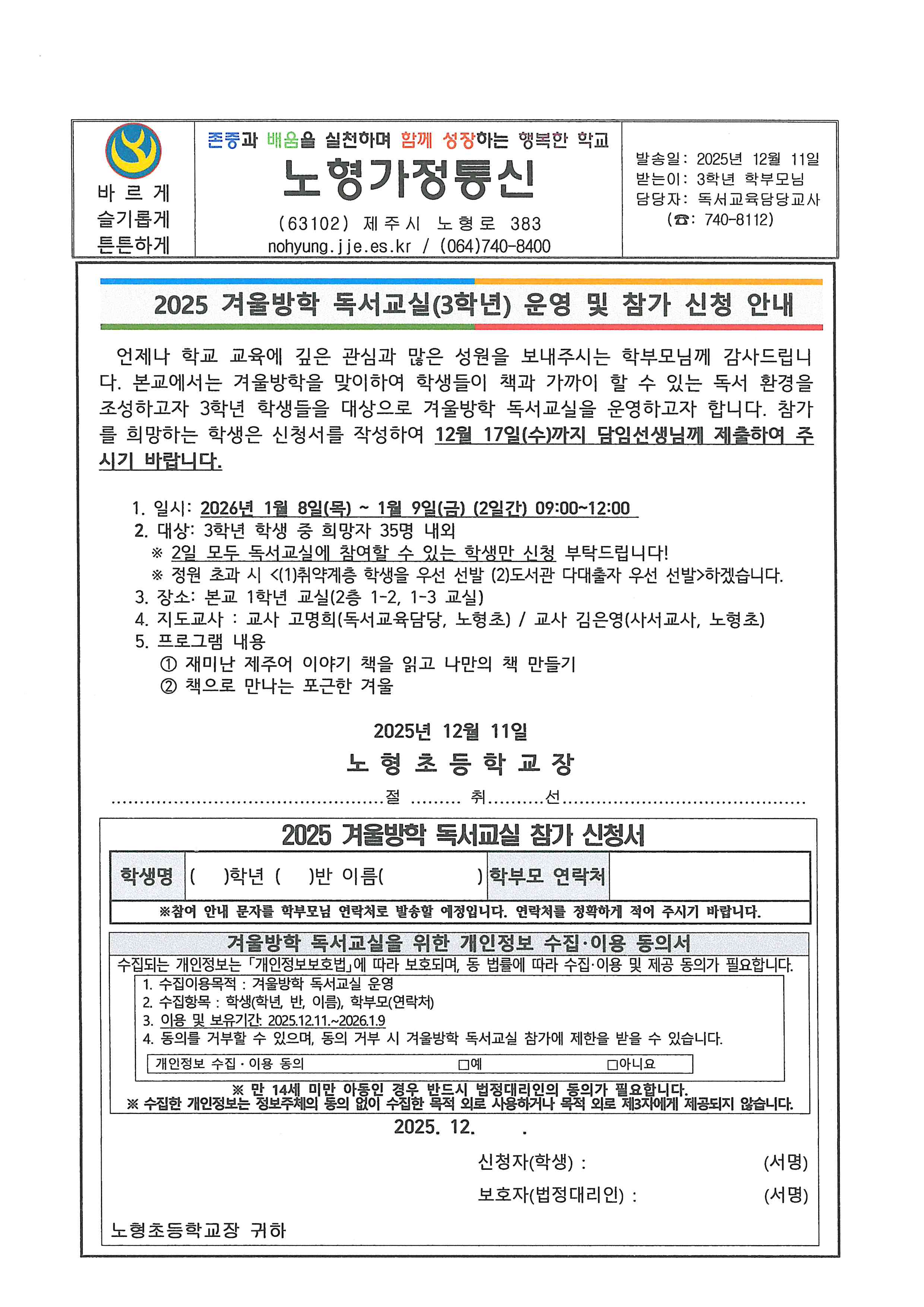 2025 겨울방학 독서교실(3학년) 운영 및 참가 신청 안내