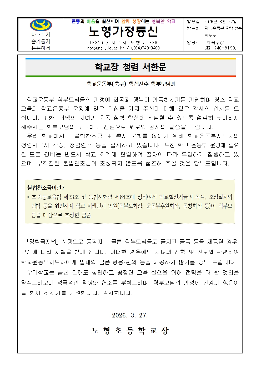 [제주특별자치도교육청 가정통신문] 학생 안전 관련 사건(가출, 실종, 유괴, 교통사고 등) 발생 시 대응 협조 가종통신문