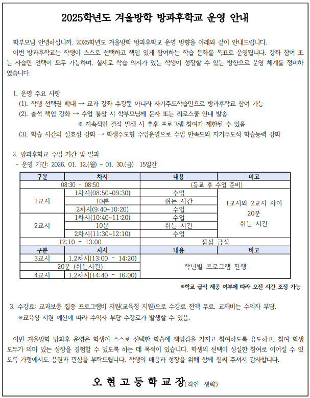 2025학년도 겨울방학 방과후학교 운영 안내