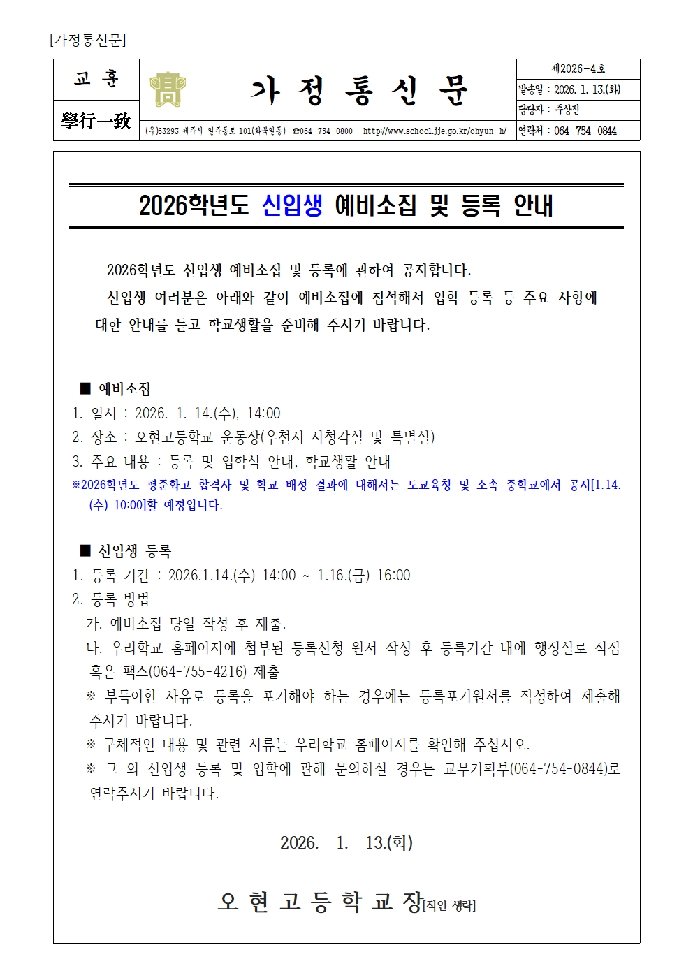 2026학년도 신입생 예비소집 및 등록 안내