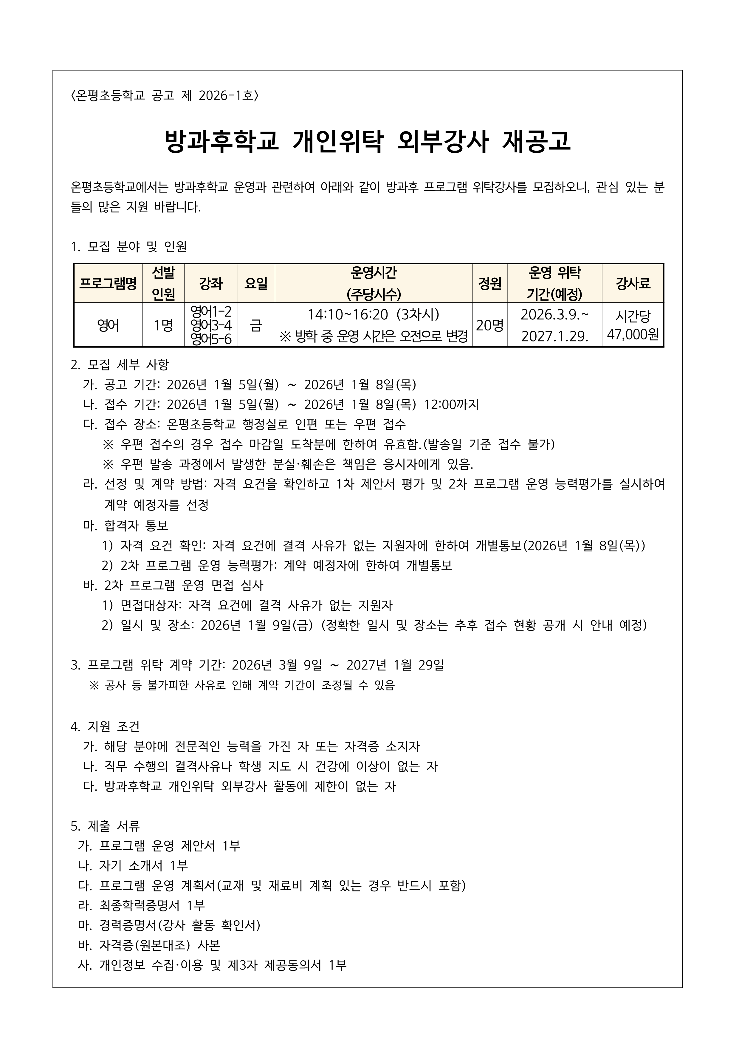 2026학년도 방과후학교 위탁 강사 재공고(온평초).hwpx