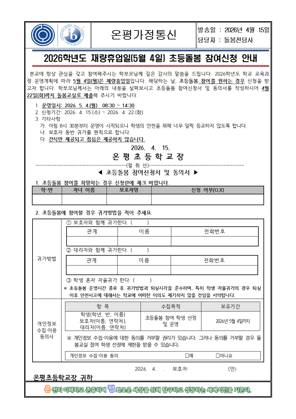 2026학년도 재량휴업일(5월 4일) 초등돌봄 참여신청 안내