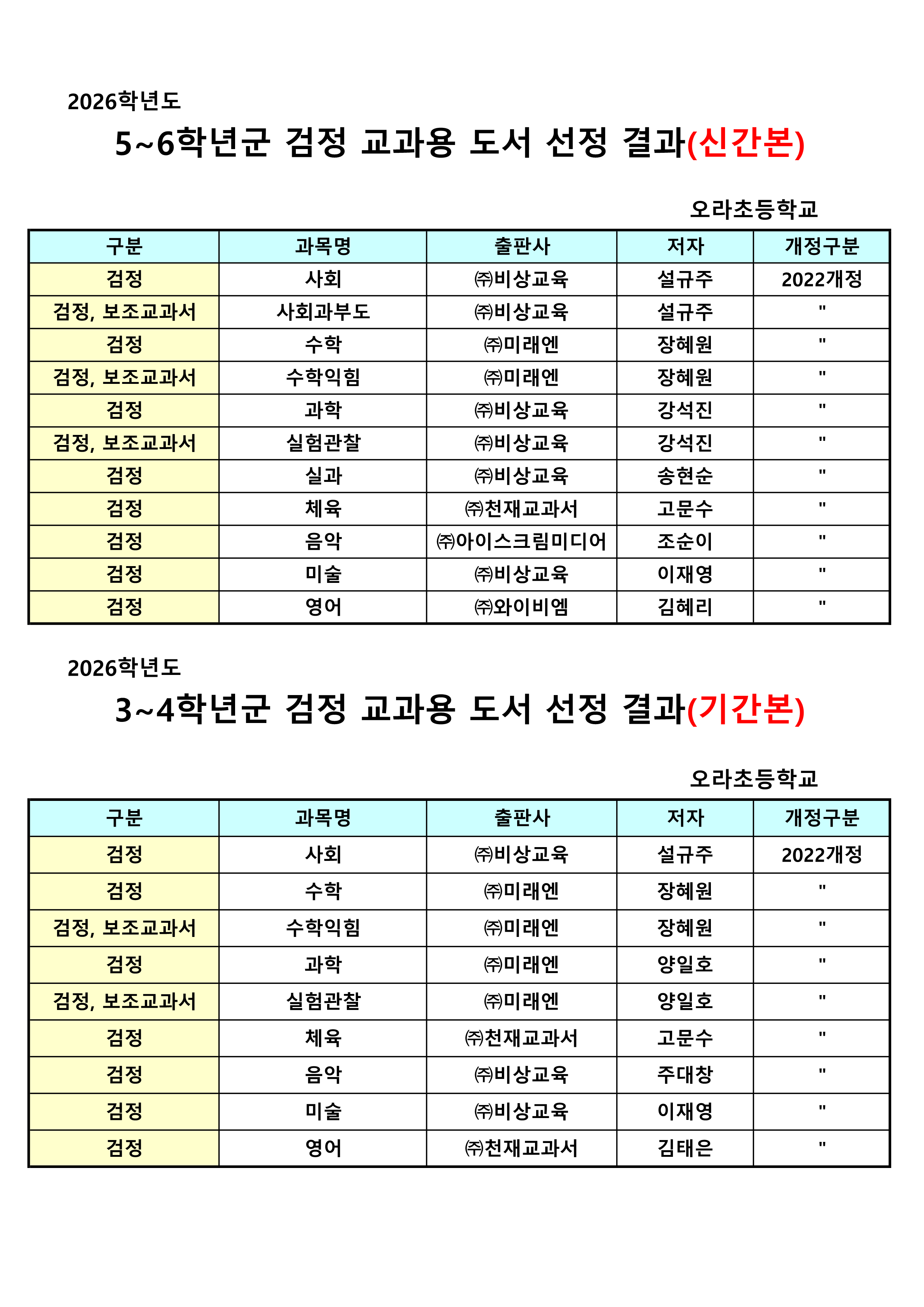 3. 2022개정 교육과정이 2026학년도에 5~6학년까지 파급, 적용됨에 따라 다음과 같이 검정 교과용도서를 선정하여 결과를 안내해 드립니다.