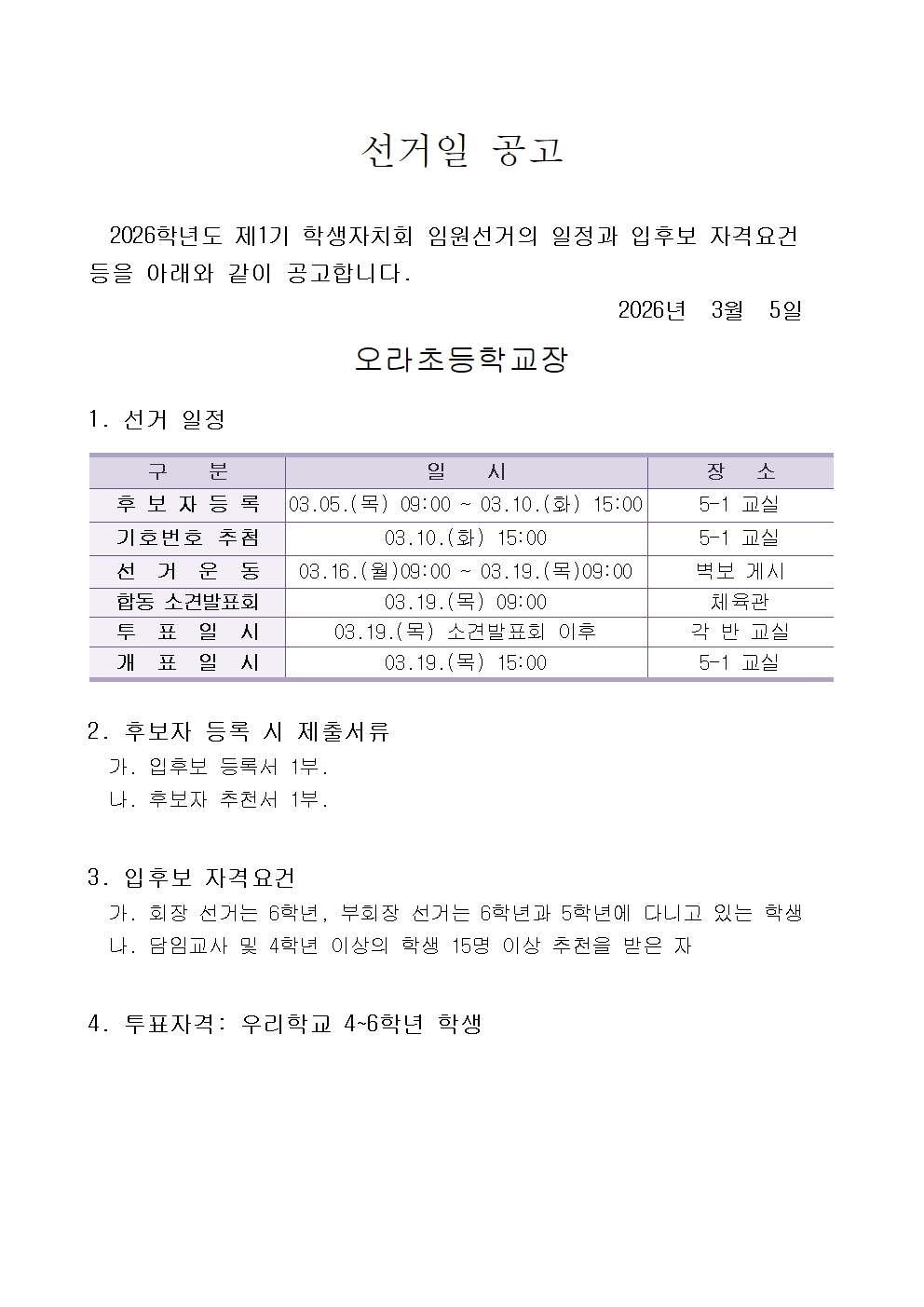 2026학년도 오라초등학교운영위원회 및 위원 선출 홍보