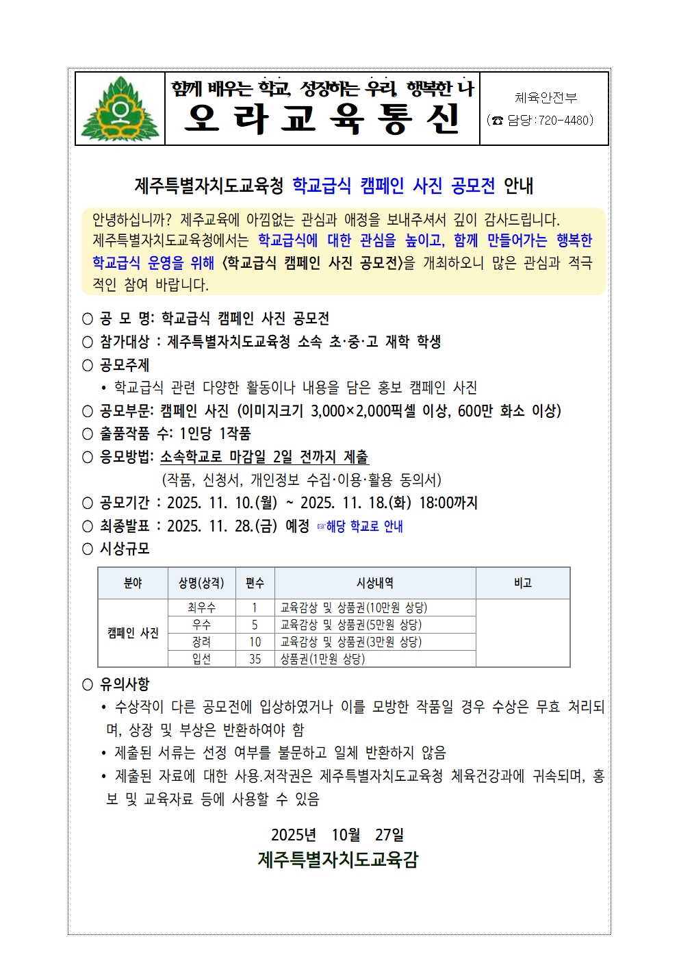 제주특별자치도교육청 학교급식 캠페인 사진 공모전 안내