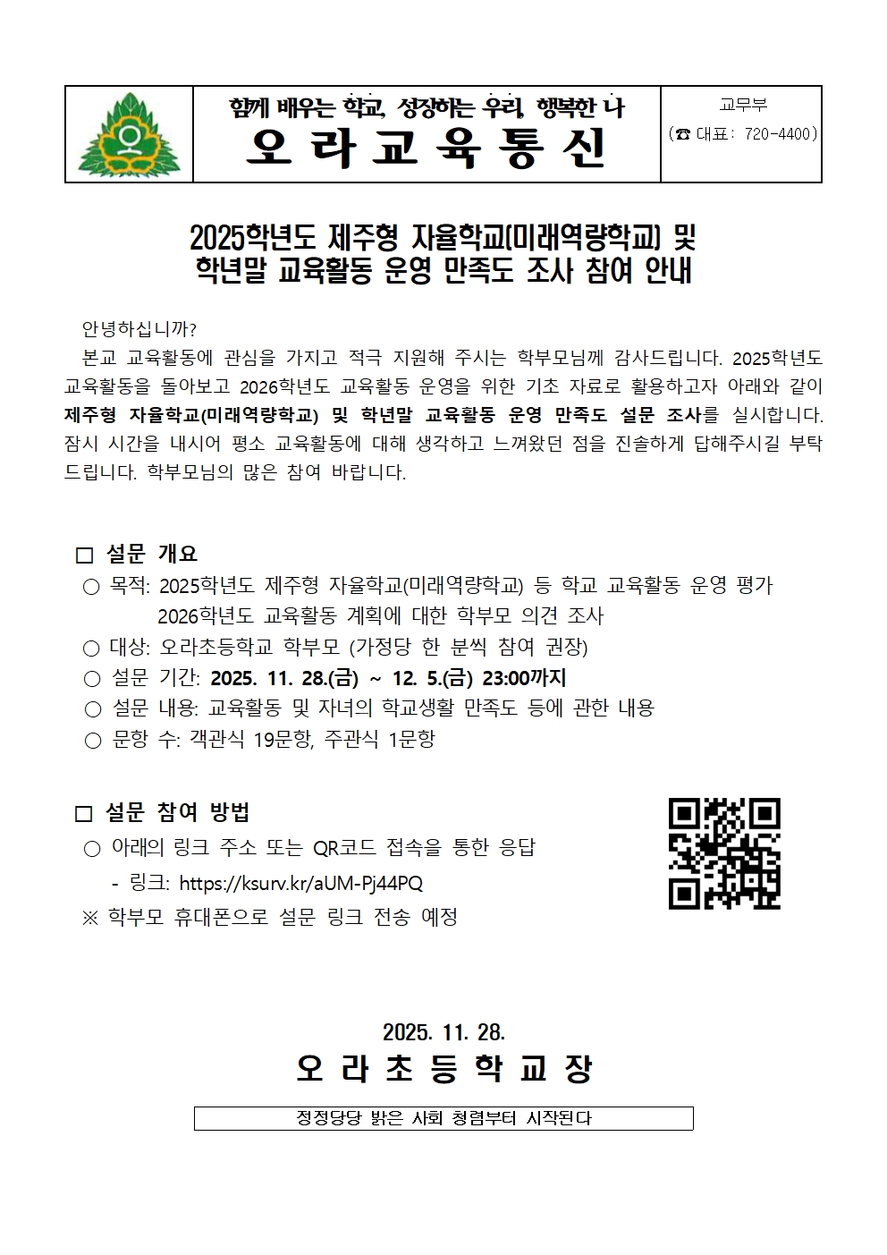 2025학년도 제주형 자율학교 및 학교 교육활동 만족도 조사 참여 안내