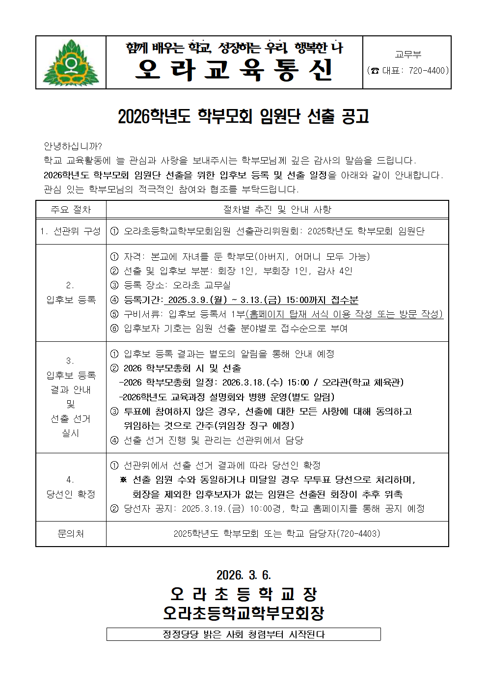 2026학년도 학부모회 임원단 선출 공고