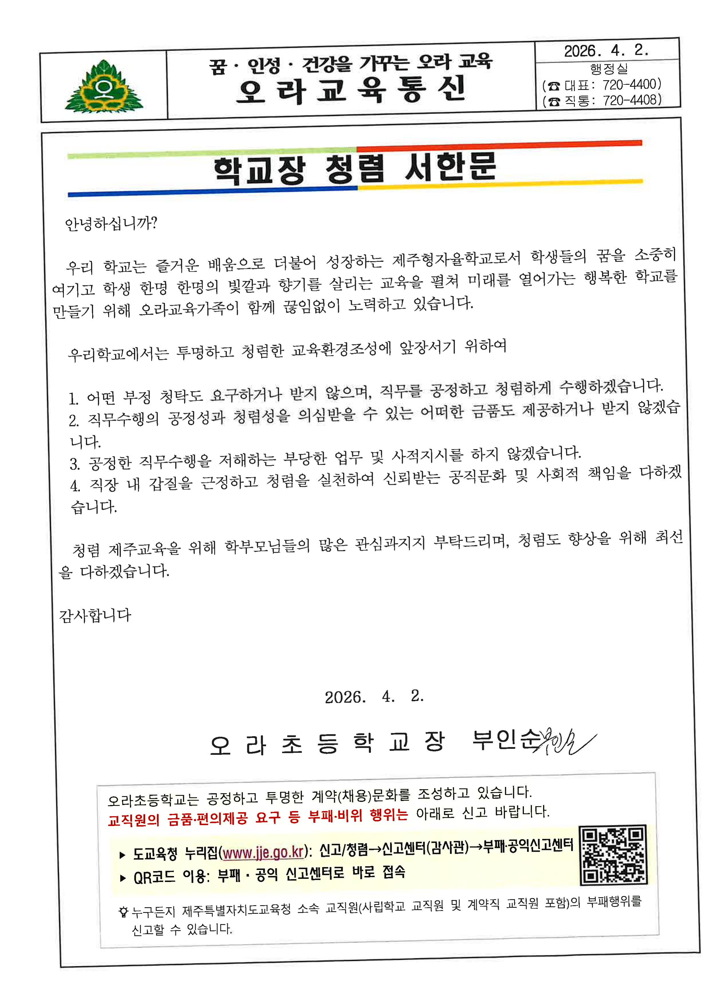 2026학년도 4월 학교장 청렴서한문