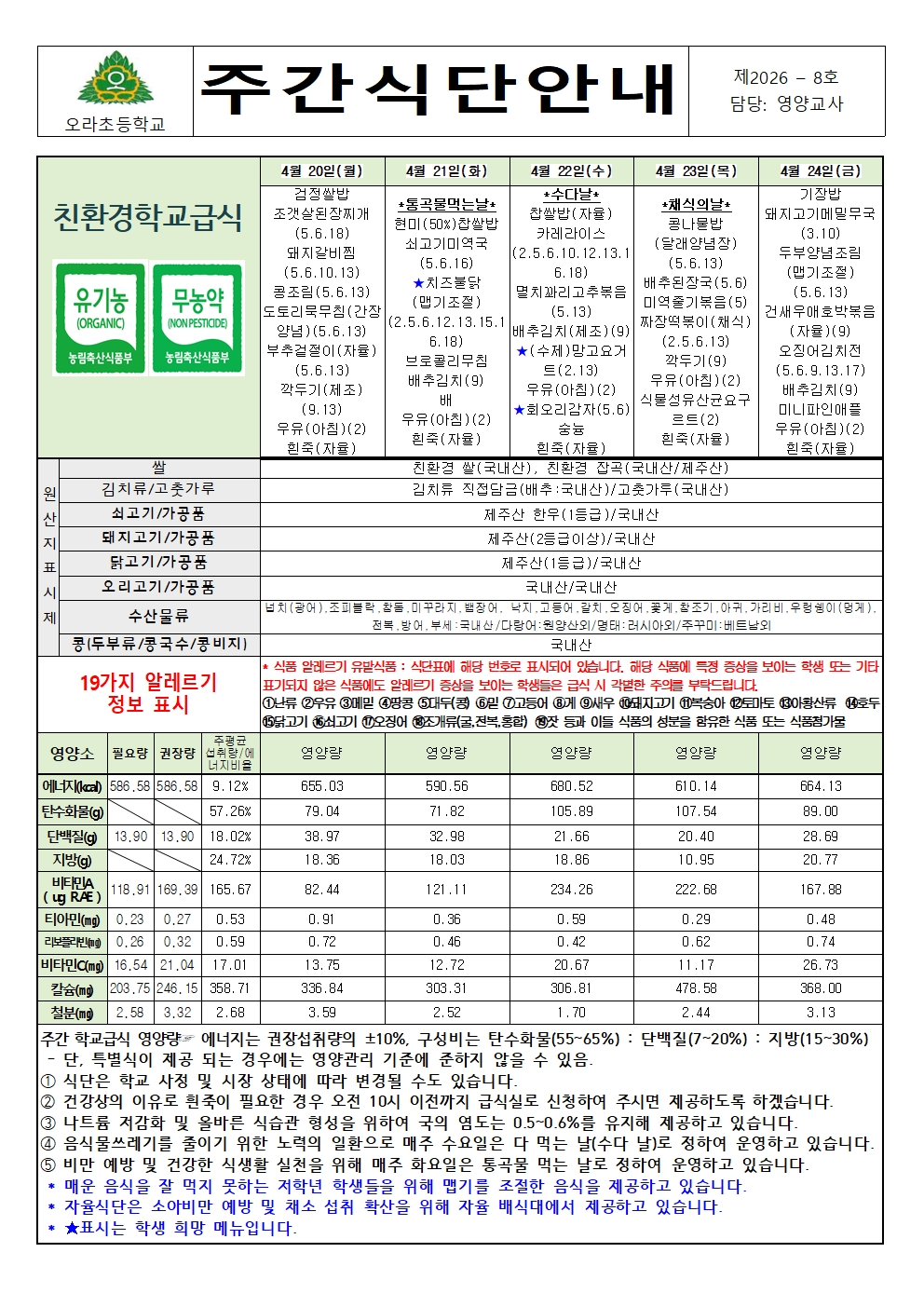 2026.4.20~4.24 주간식단 안내 및 식생활교육(봄철 식중독 예방법)