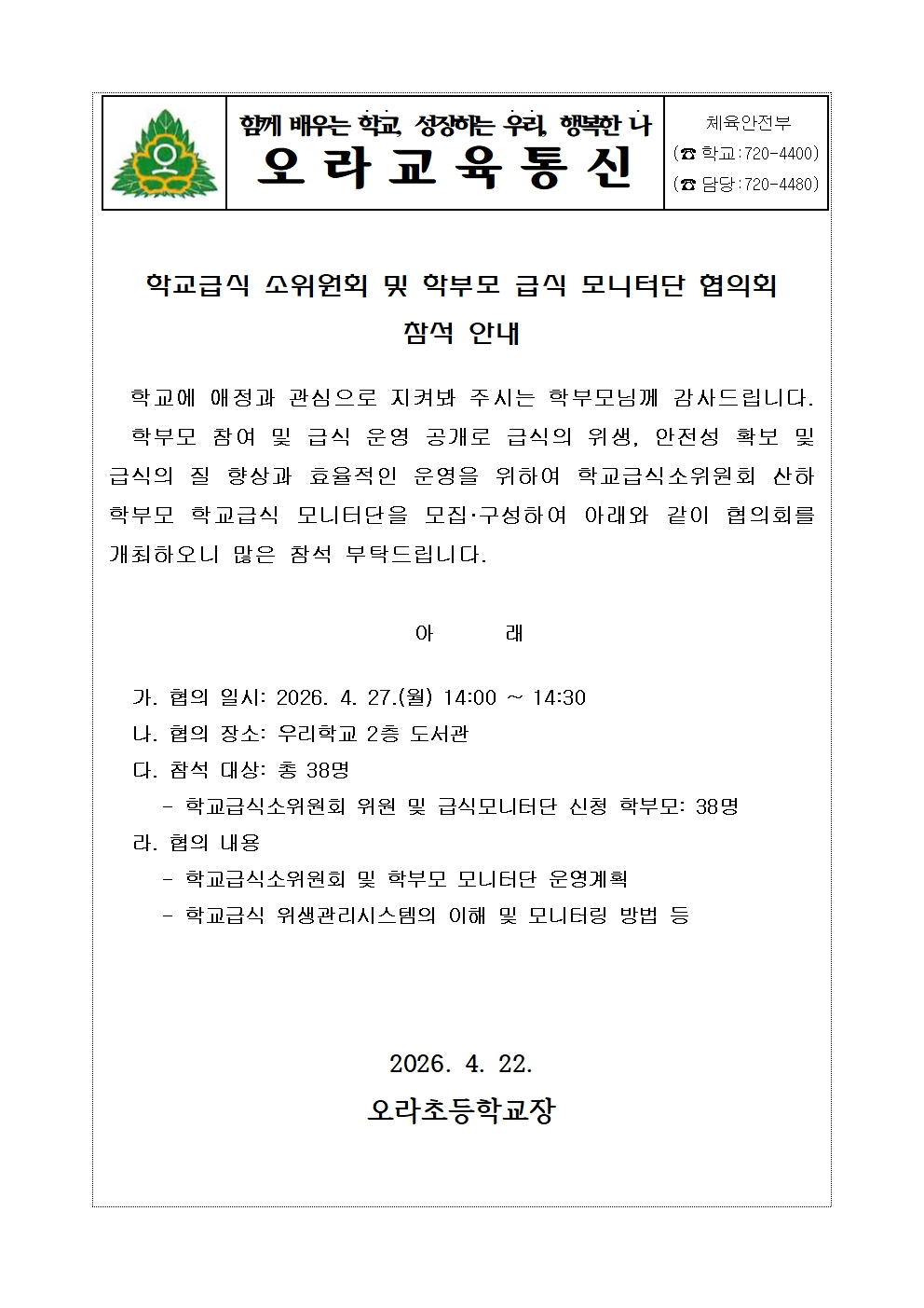 2026학년도 학교급식 소위원회 및 학부모 급식 모니터단 협의회 참석 안내(신청자만 해당)