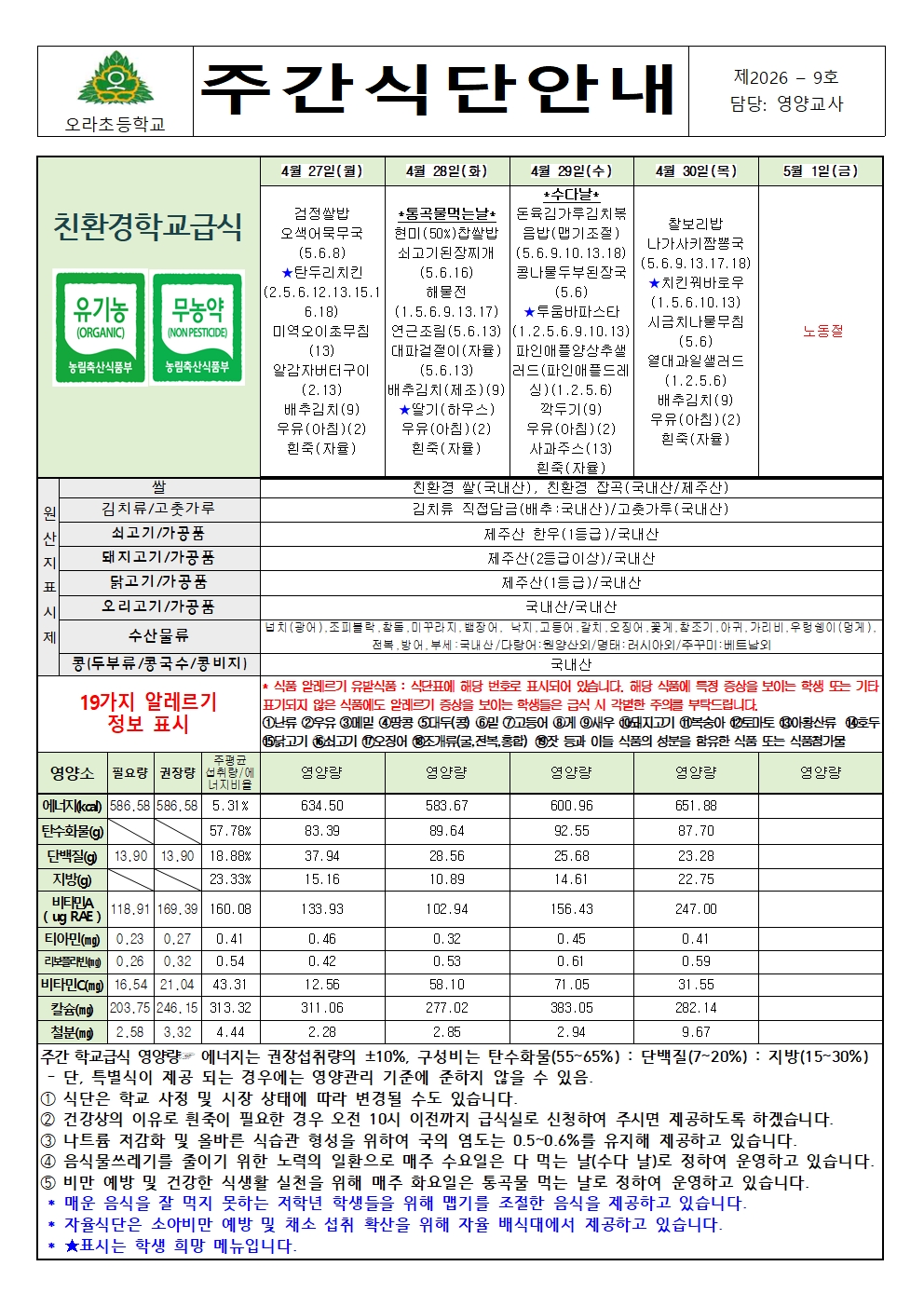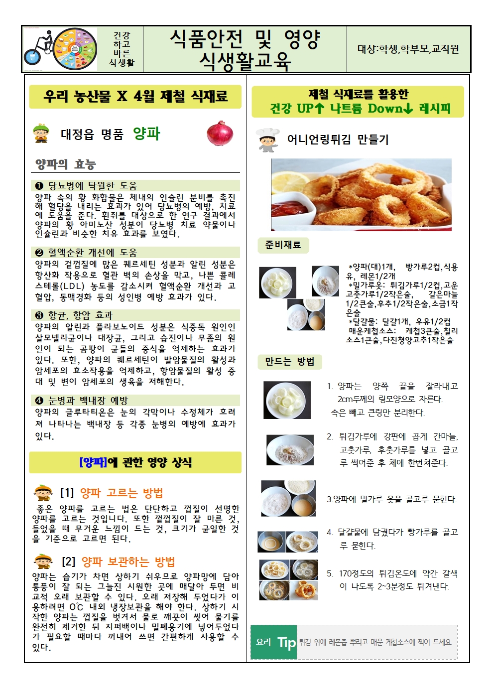 2026.4.27~5.1 주간식단 안내 및 식생활 교육(4월 제철식재료, 양파)