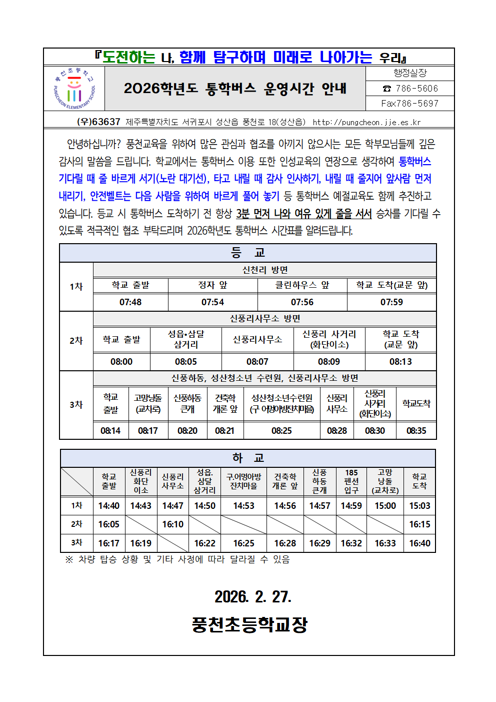 2026학년도 통학버스 시간표 안내