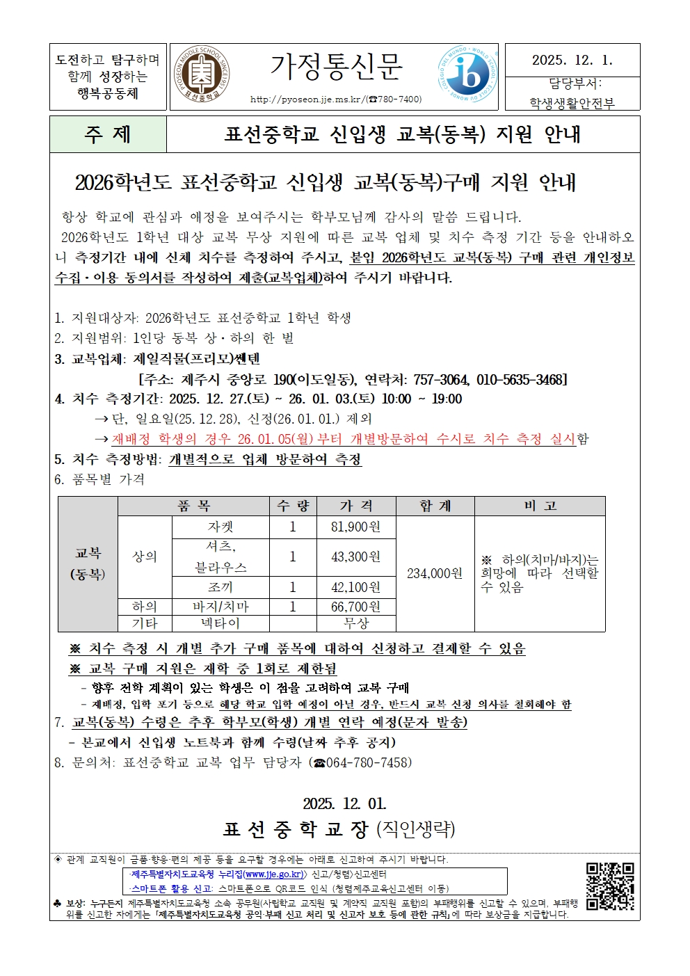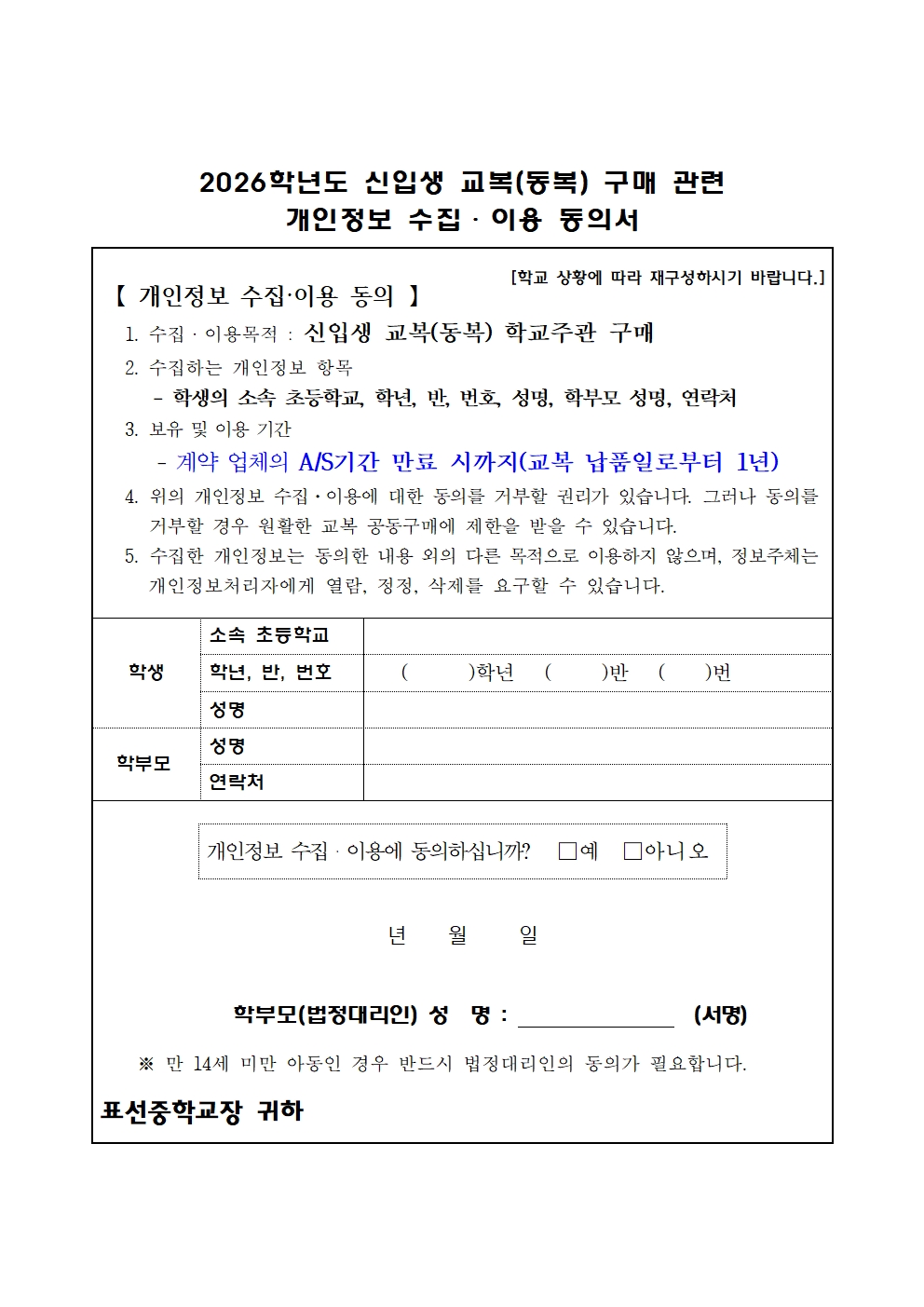 2026학년도 신입생 교복(동복)구매 지원 안내문 및 개인정보 수집 이용 동의서(표선중)