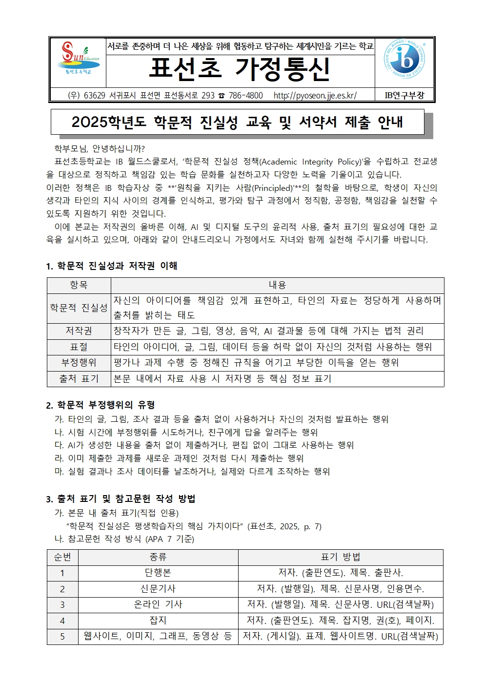 표선초등학교는 IB 월드스쿨로서, ‘학문적 진실성 정책(Academic Integrity Policy)’을 수립하고 전교생을 대상으로 정직하고 책임감 있는 학습 문화를 실천하고자 다양한 노력을 기울이고 있습니다.