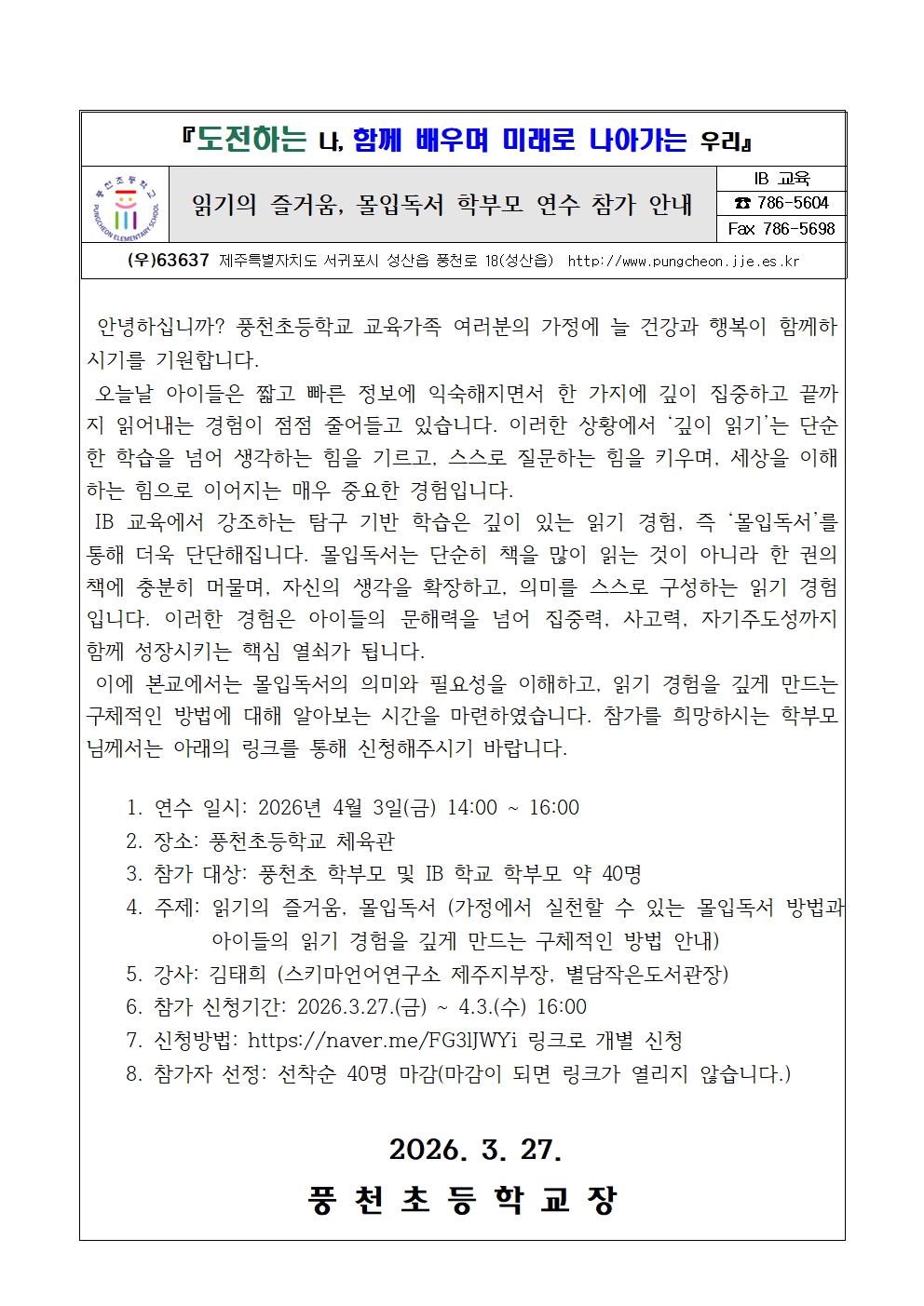 풍천초 읽기의 즐거움, 몰입독서 학부모 연수 안내