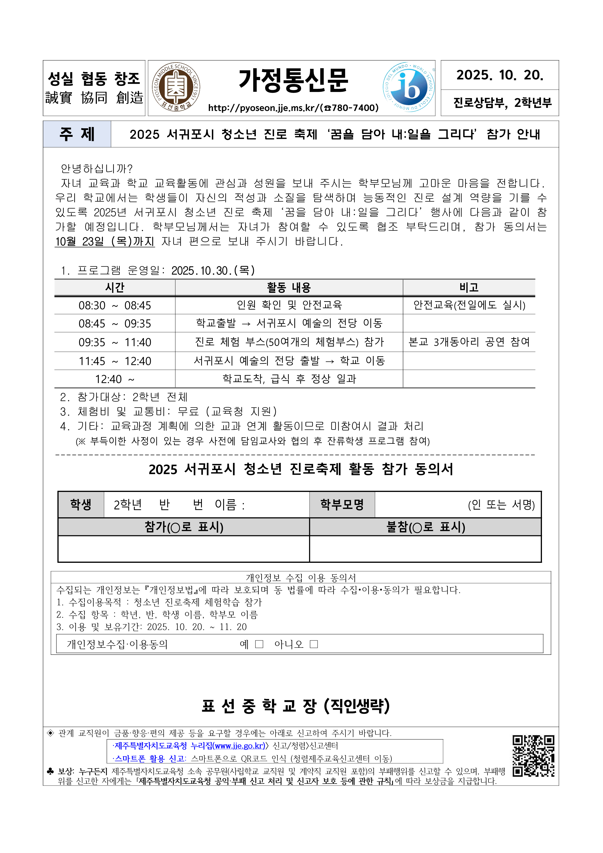 2025 서귀포시 청소년 진로축제 '꿈을 담아 내:일을 그리다' 참가 안내