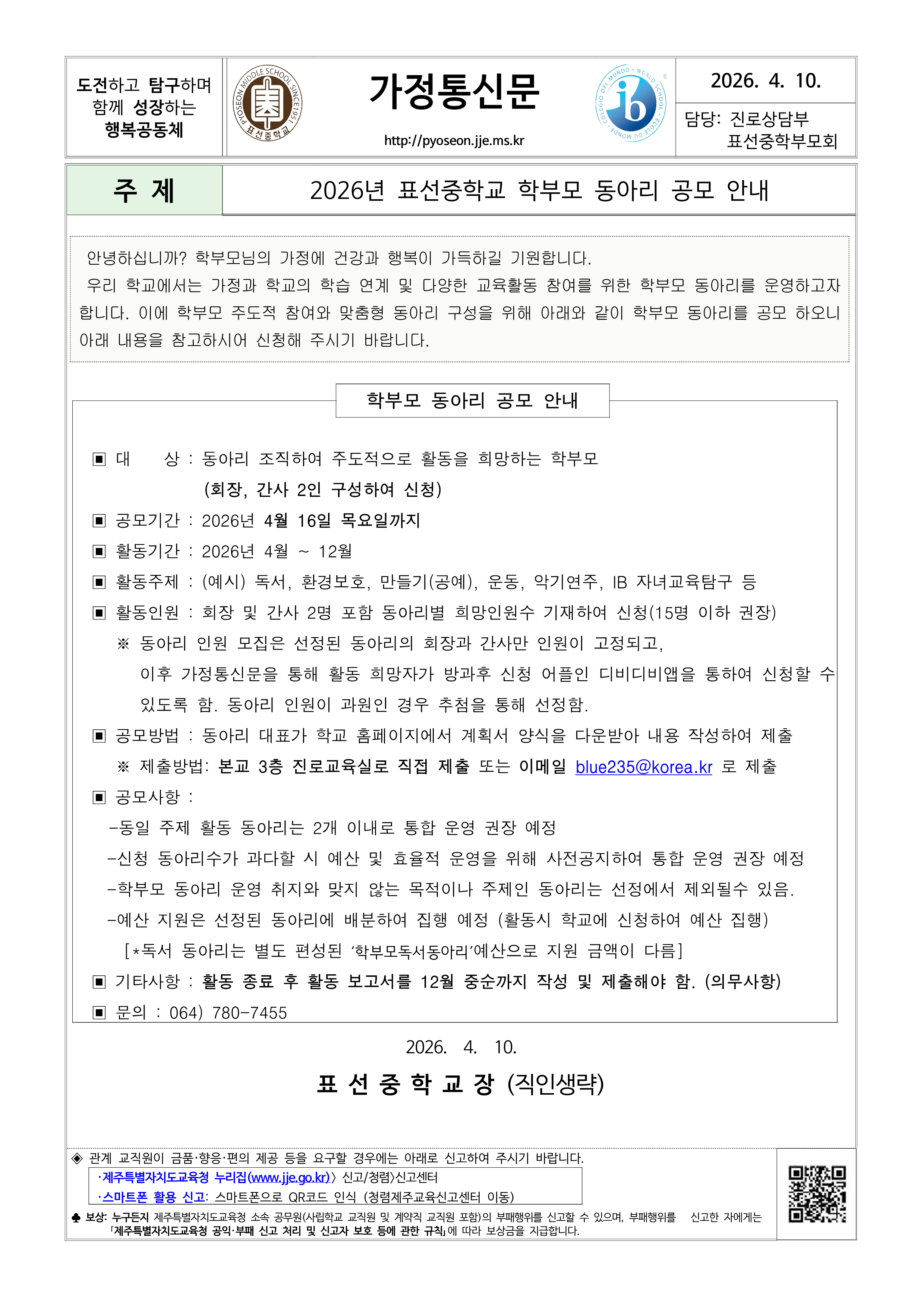 [제주특별자치도교육청 가정통신문] 2026년 1차 학교폭력 실태조사(전수조사) 참여 안내 가정통신문