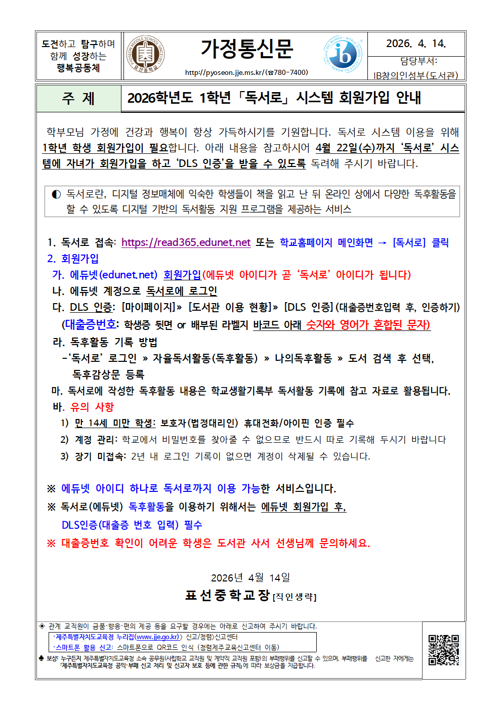 2026학년도 1학년 [독서로] 시스템 회원가입 안내