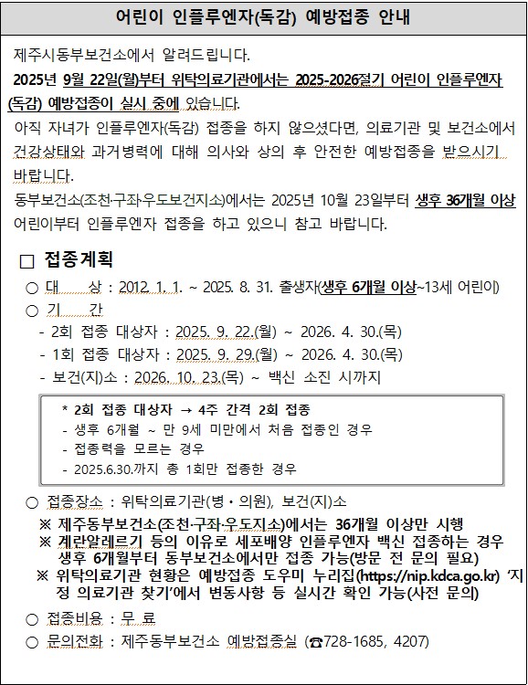 2025-2026절기 어린이 인플루엔자(독감) 예방접종 안내-제주시동부보건소