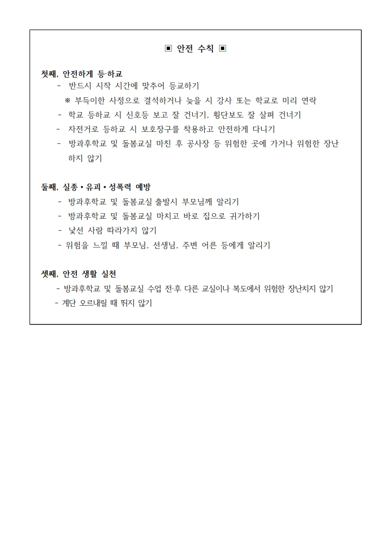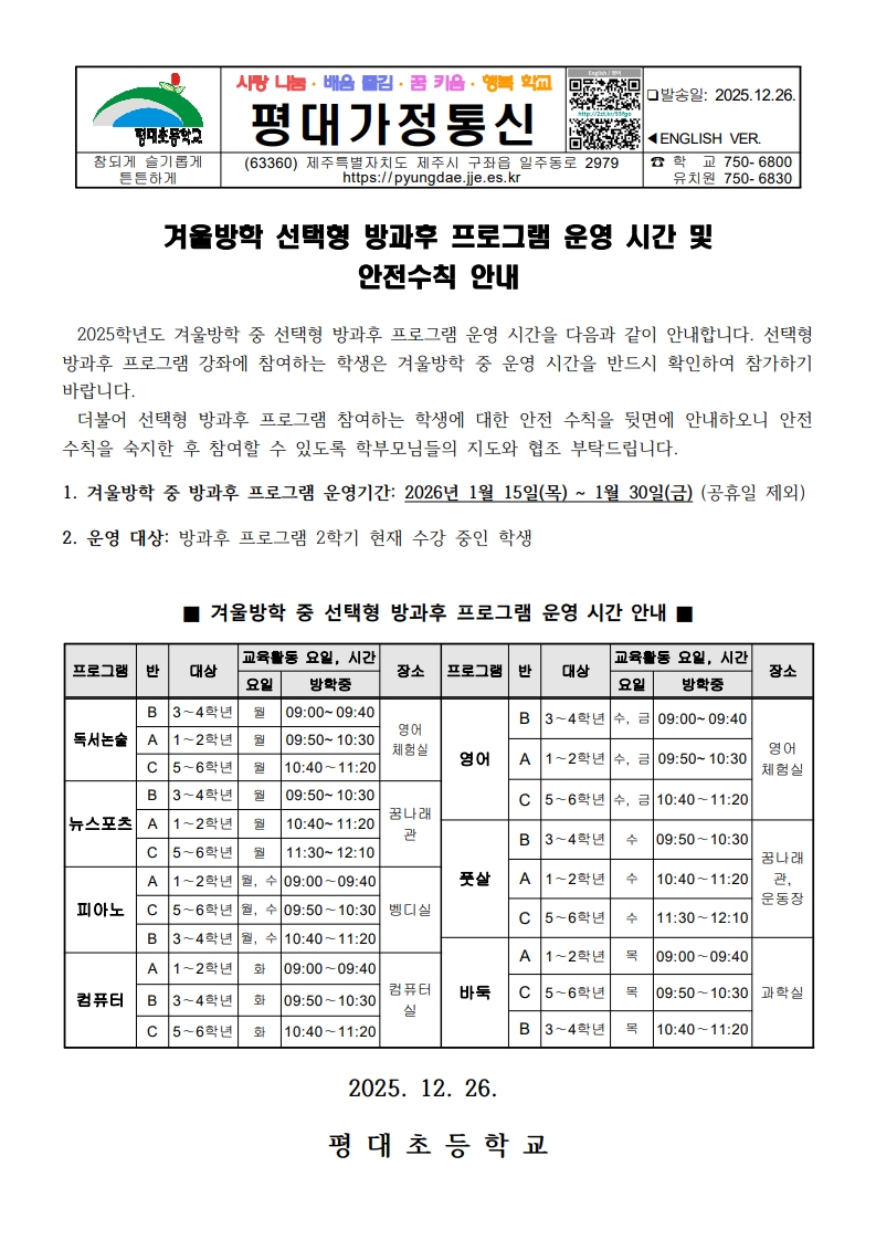 겨울방학 선택형 방과후 프로그램 운영 시간 및 안전수칙 안내