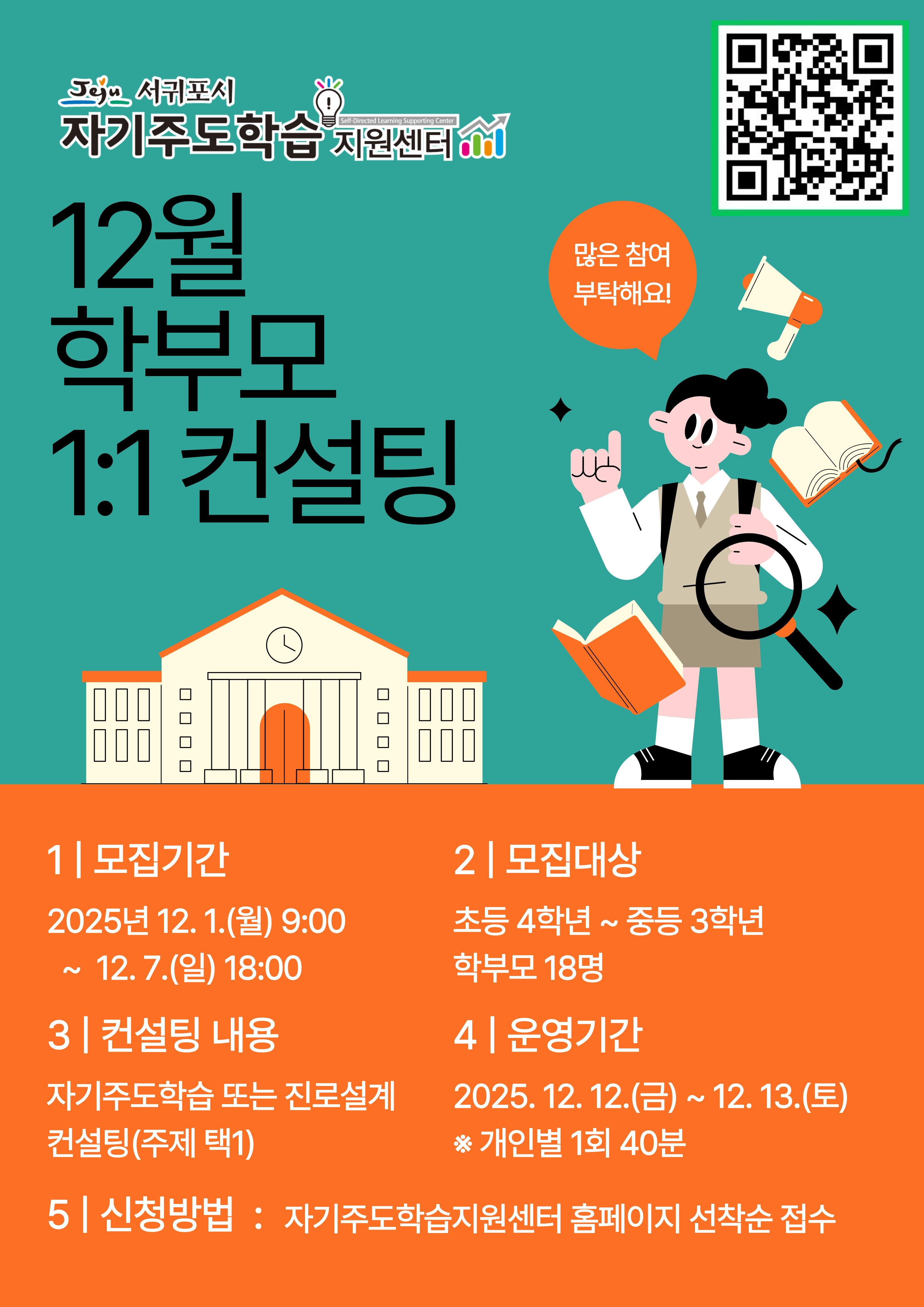서귀포시 자기주도학습지원센터에서는 2025년 12월 학부모 1:1 컨설팅 프로그램 참여자를 아래와 같이 모집할 예정입니다. 자녀의 자기주도학습 및 진로 설계 상담 기회를 원하시는 학부모님께서는 아래의 내용을 참고하여 신청하시기 바랍니다.