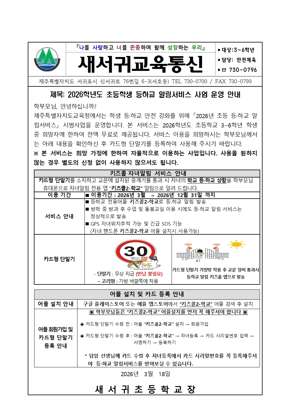 2026학년도 초등학생 등하교 알림서비스 사업 운영 안내(3~6학년)