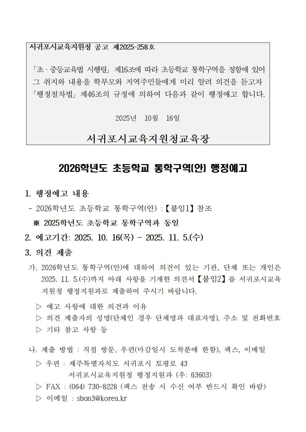 2026학년도 초등학교 통학구역(안) 행정예고 알림