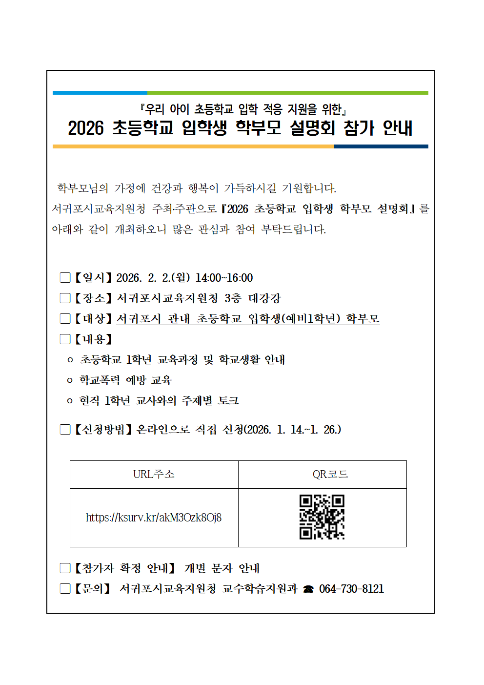 2026 초등학교 입학생 학부모 설명회 개최 안내