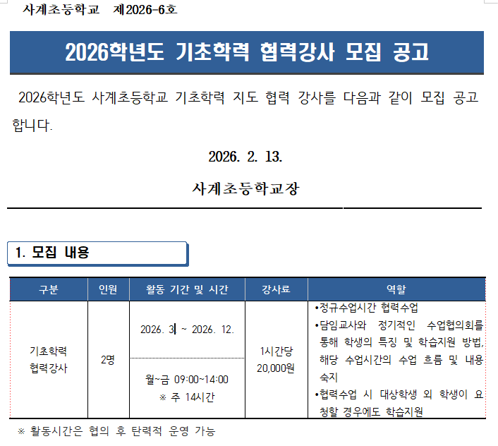 2026학년도 기초학력 협력강사 모집 공고_사계초.hwpx