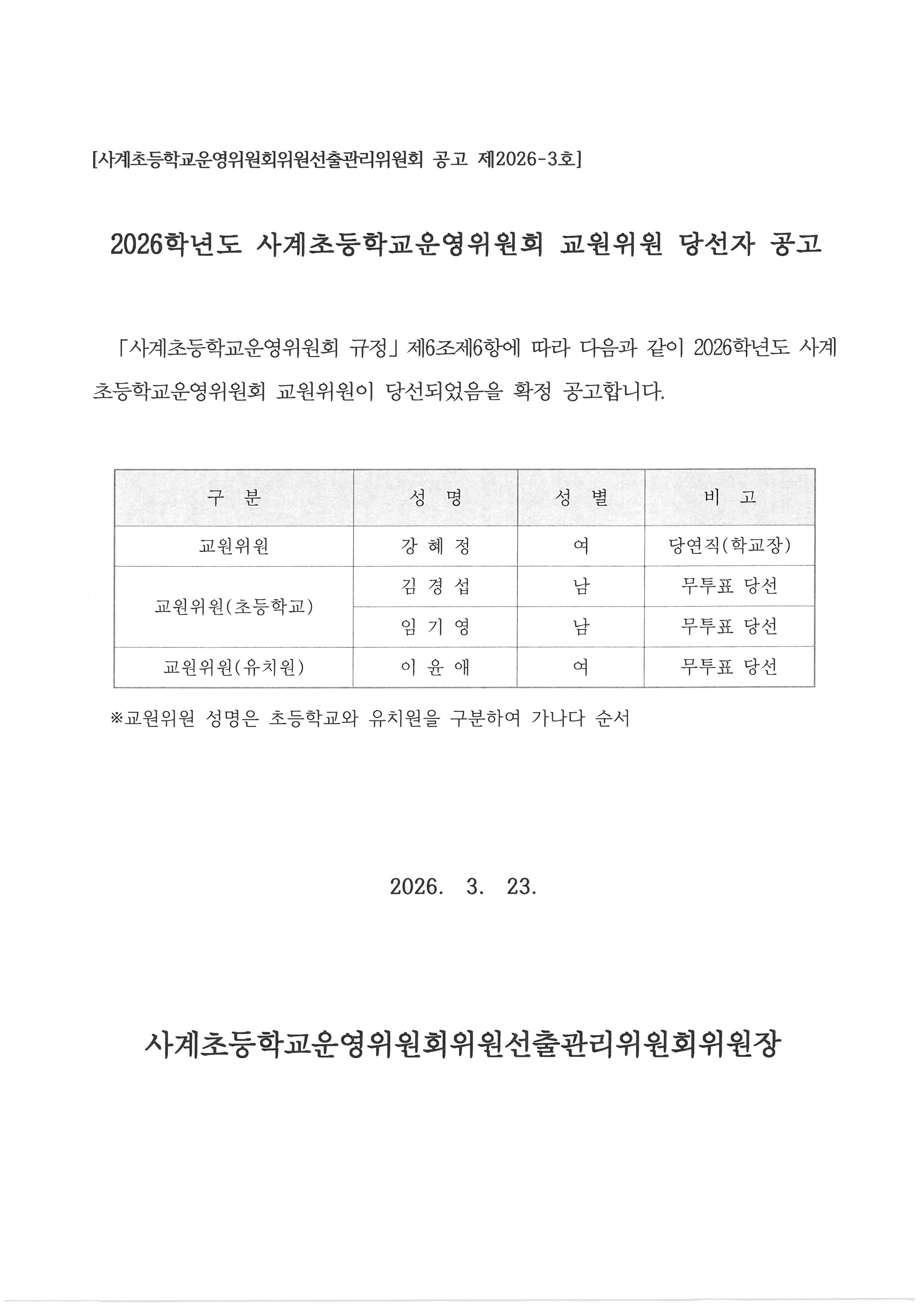 2026학년도 사계초등학교운영위원회 교원위원 당선자 공고