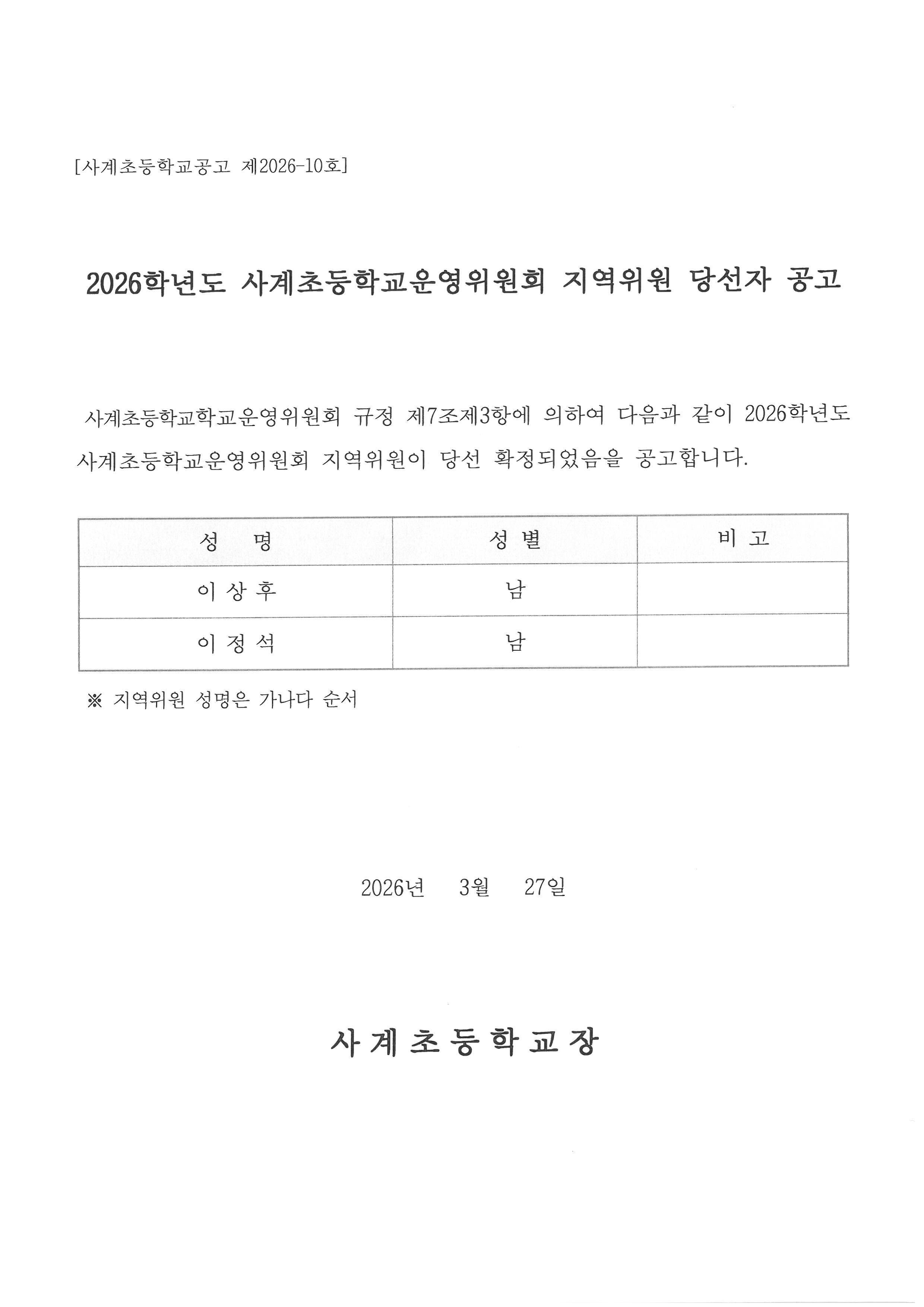 2026학년도 사계초등학교운영위원회 지역위원 당선자 공고