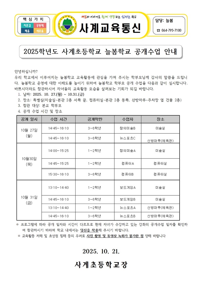 2025학년도 사계초등학교 늘봄학교 공개수업 안내