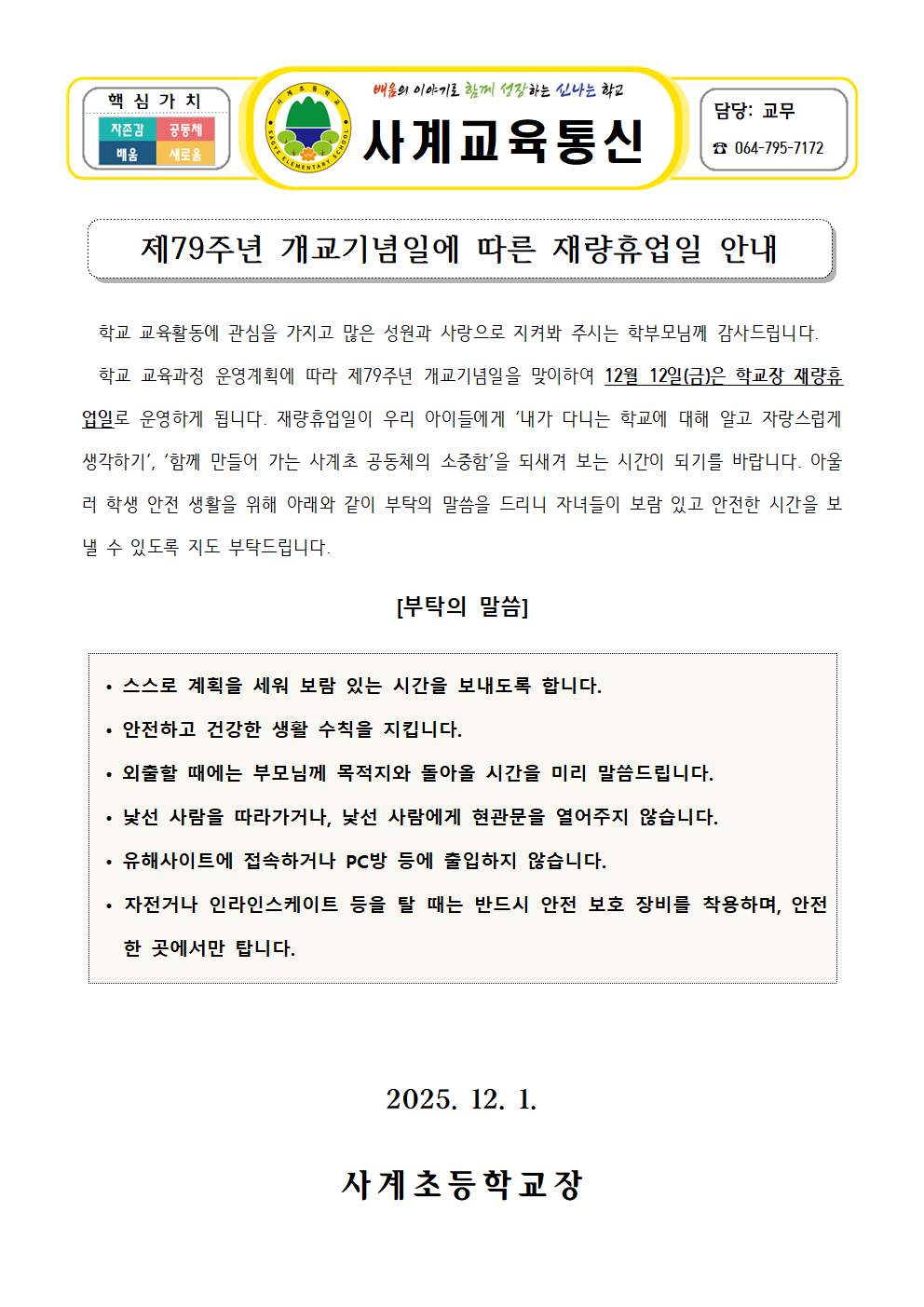 제79주년 개교기념일에 따른 재량휴업일 안내