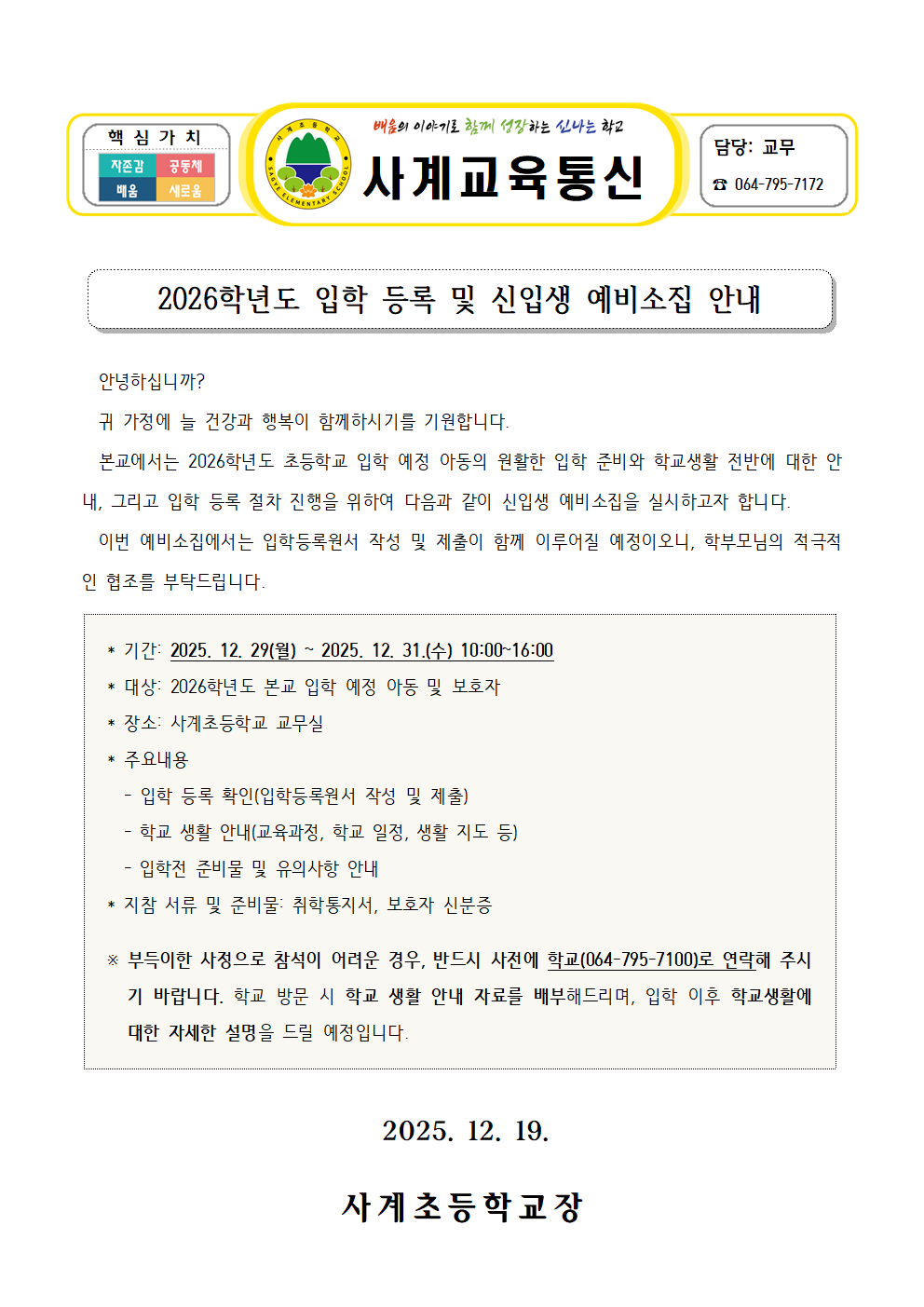 2026학년도 입학 등록 및 신입생 예비소집 안내