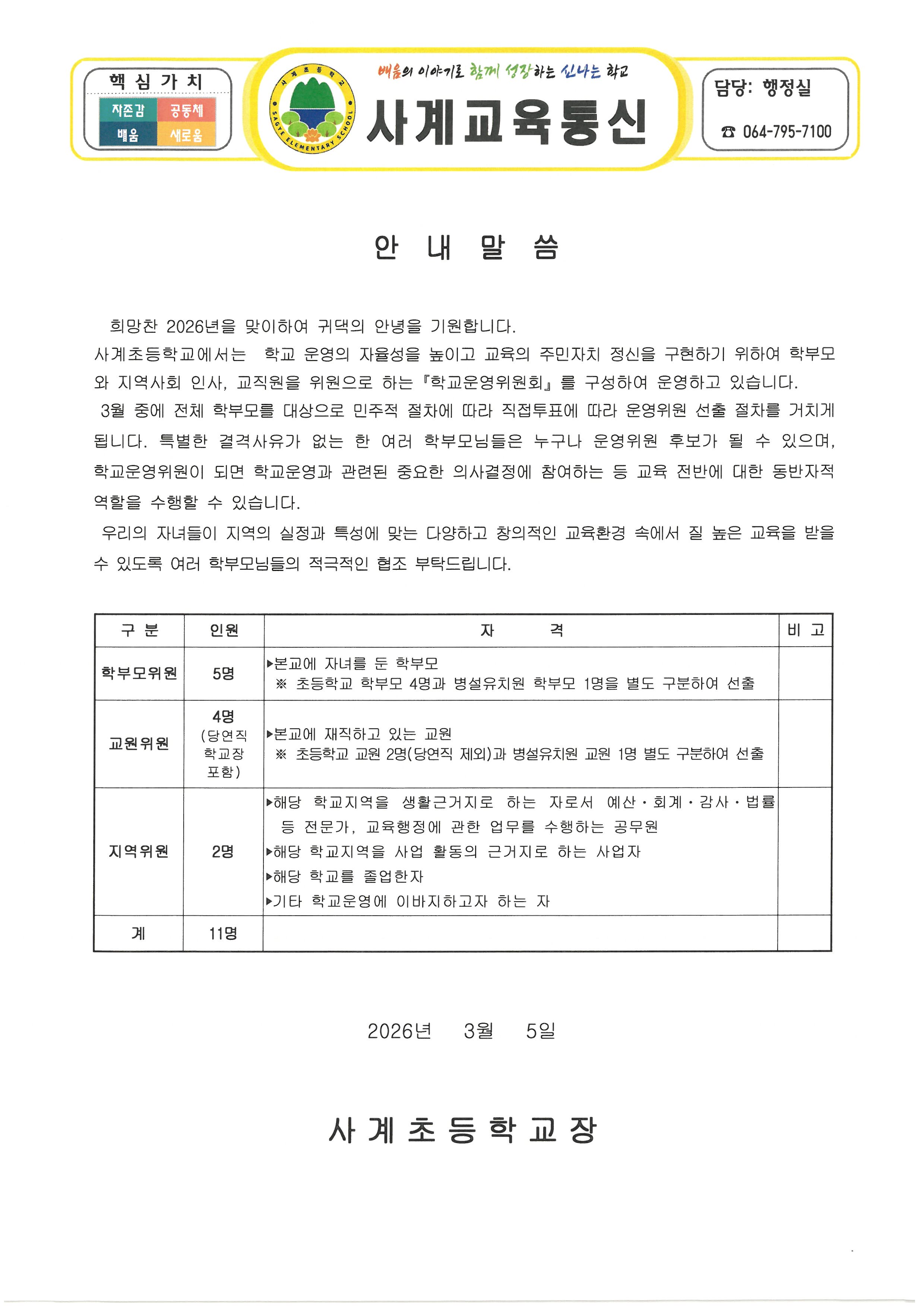 2026학년도 학교운영위원회 위원 선출 홍보