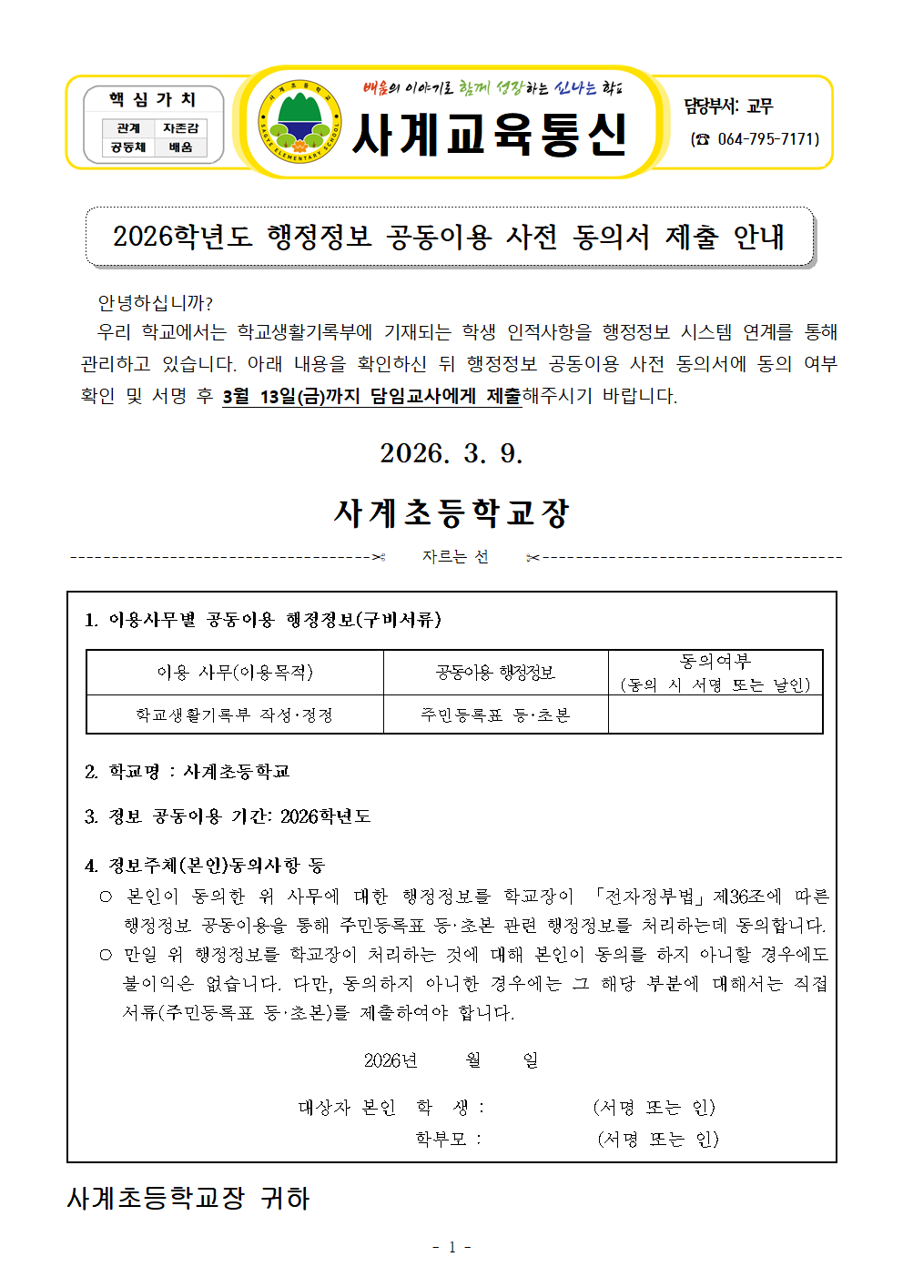 2026학년도 행정정보 공동이용 사전 동의서 제출 안내