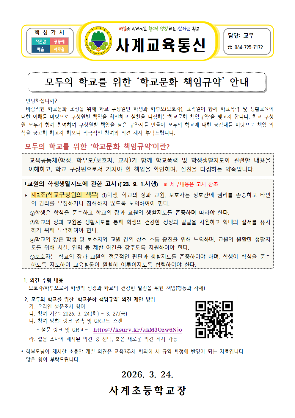 2026학년도 모두의 학교를 위한 '학교문화 책임규약' 안내
