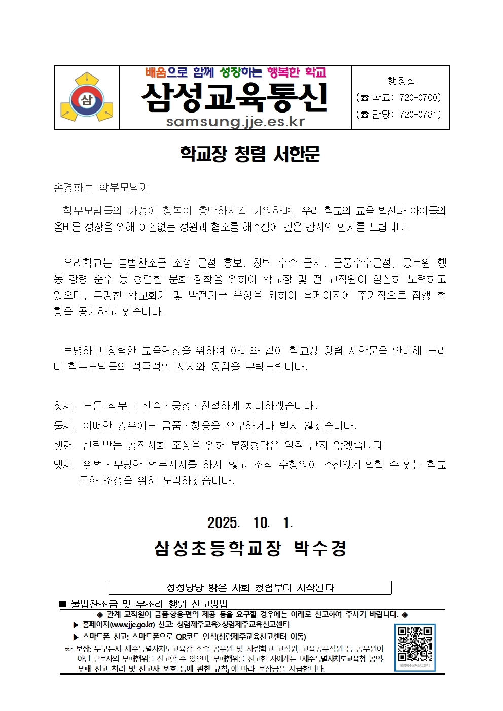 2025학년도 하반기 삼성초등학교장 청렴서한문