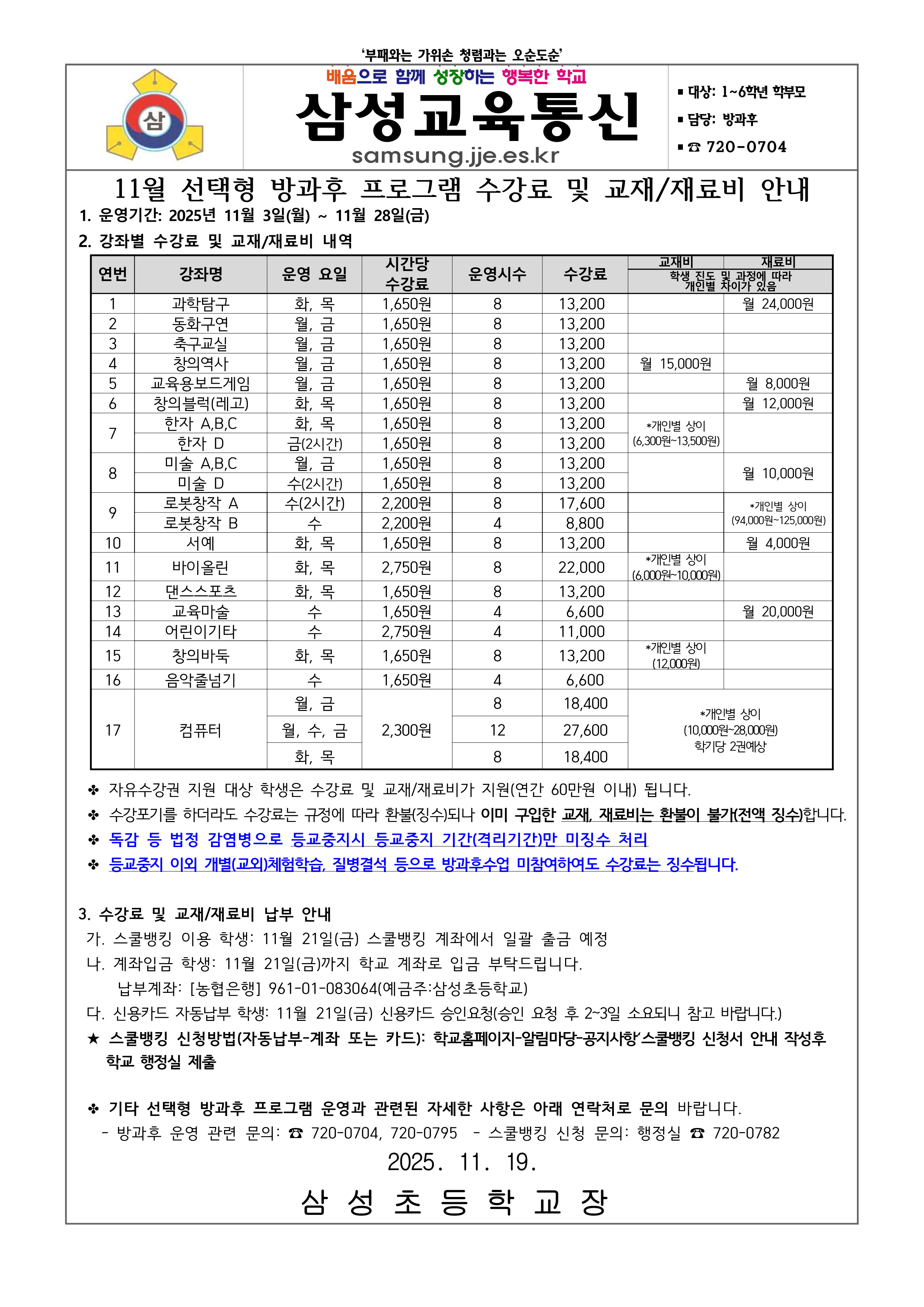2025학년도 11월 선택형 방과후 프로그램 수강료 및 교재/재료비 안내