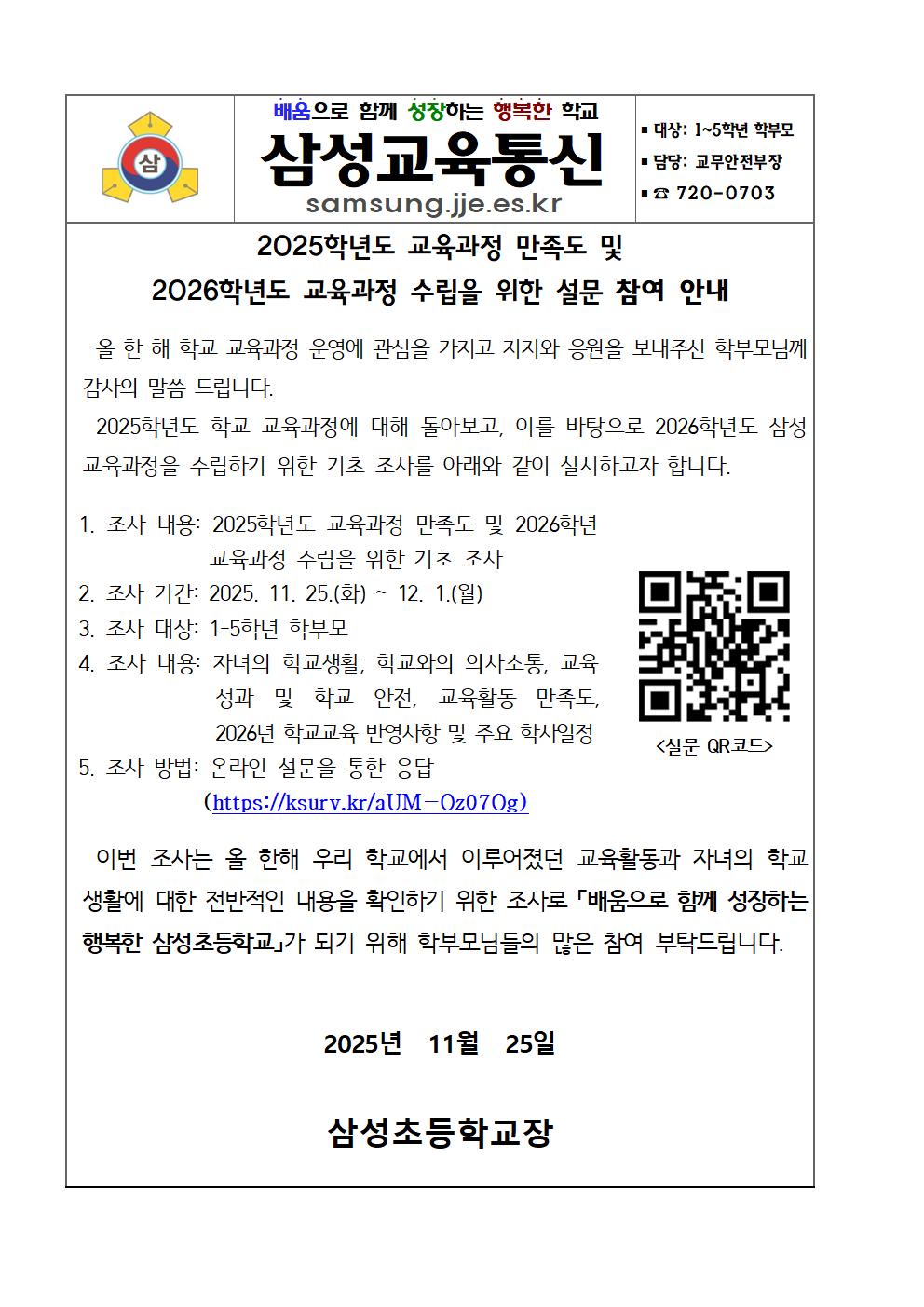 2025학년도 교육과정 만족도 및 2026학년도 교육과정 수립을 위한 설문 참여 안내