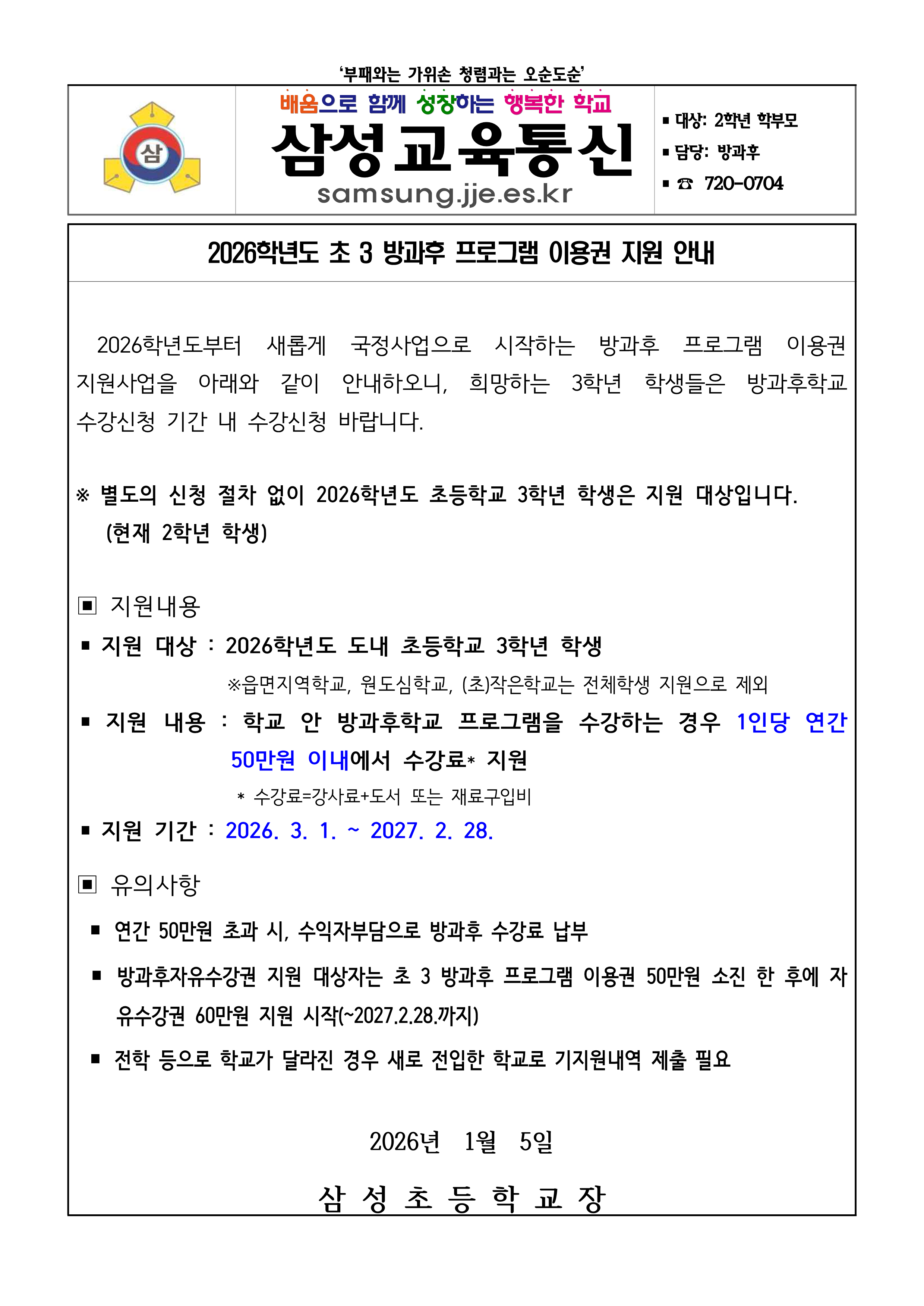 2026학년도 초3 방과후 프로그램 이용권 지원 안내