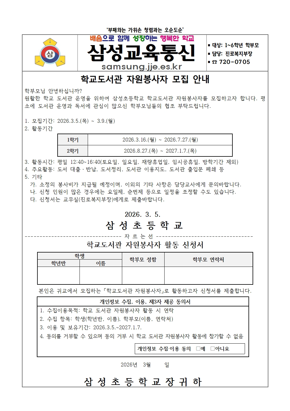 학교도서관 자원봉사자 가정통신문.hwp